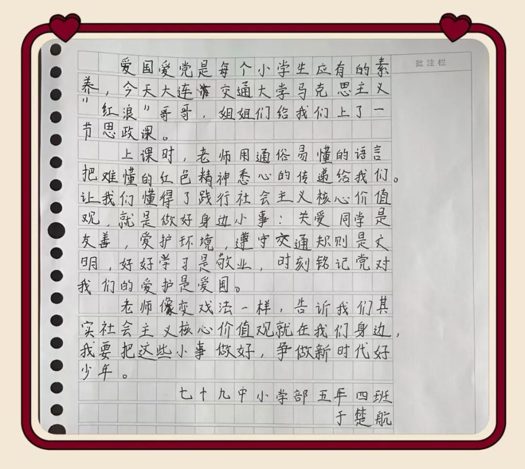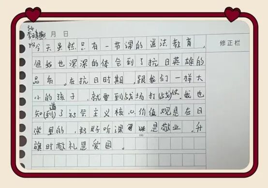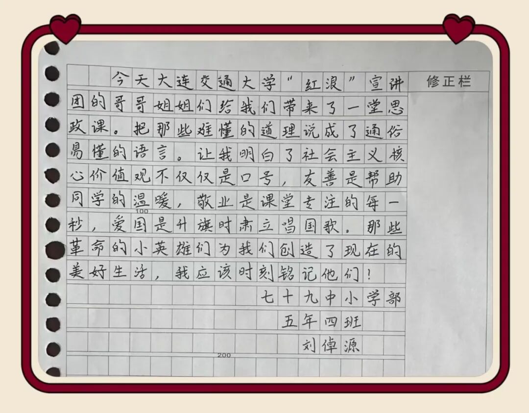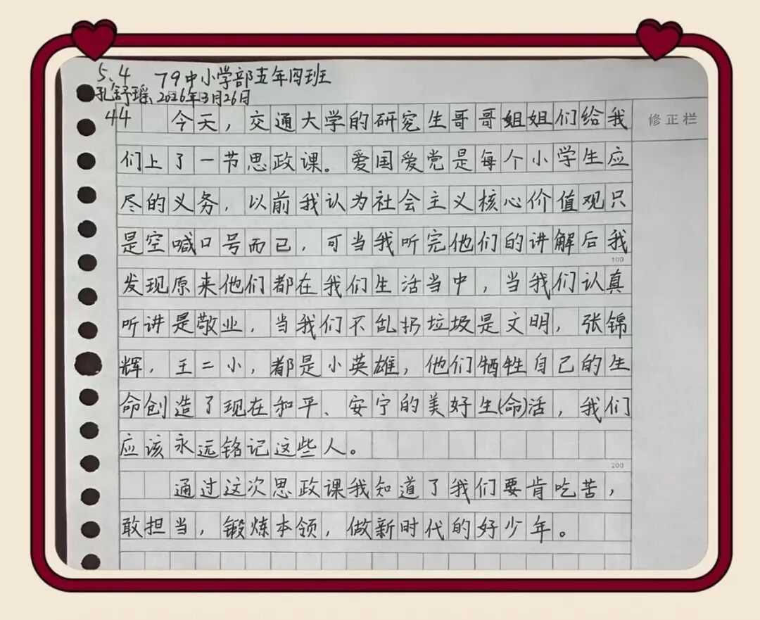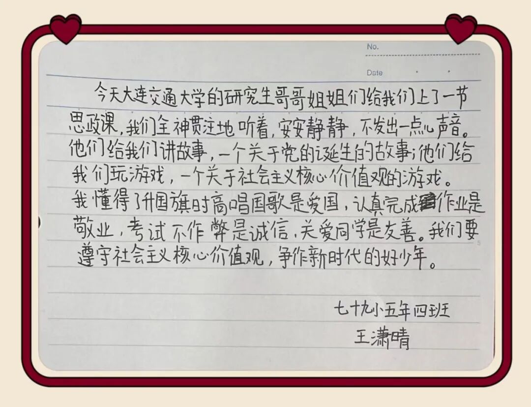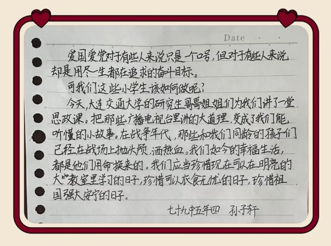 一堂浸润初心的宣讲,在同学们心中留下了深深的印记。课后,孩子们纷纷用稚嫩而真挚的语言,写下自己的所思所感————