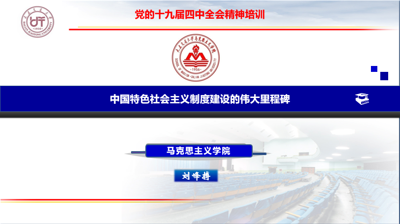 院长刘峰搏教授开讲。他以“解读党的十九届四中全会精神”为主要内容,纵横古今、放眼世界,深刻阐述了党的十九届四中全会是中国特色社会主义制度建设的伟大里程碑,是“道路自信、理论自信、制度自信、文化自信”的完美体现。刘峰搏院长的讲座为“唱响新时代·马院理论学习讲堂”开宗明义。