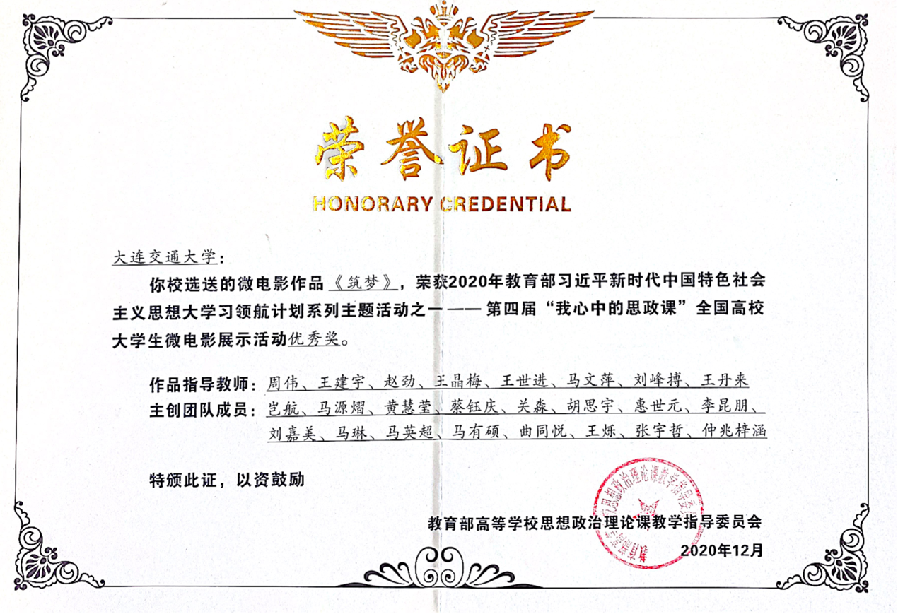 报送的作品《筑梦》在第四届“我心中的思政课”全国高校大学生微电影展示活动中荣获优秀奖。