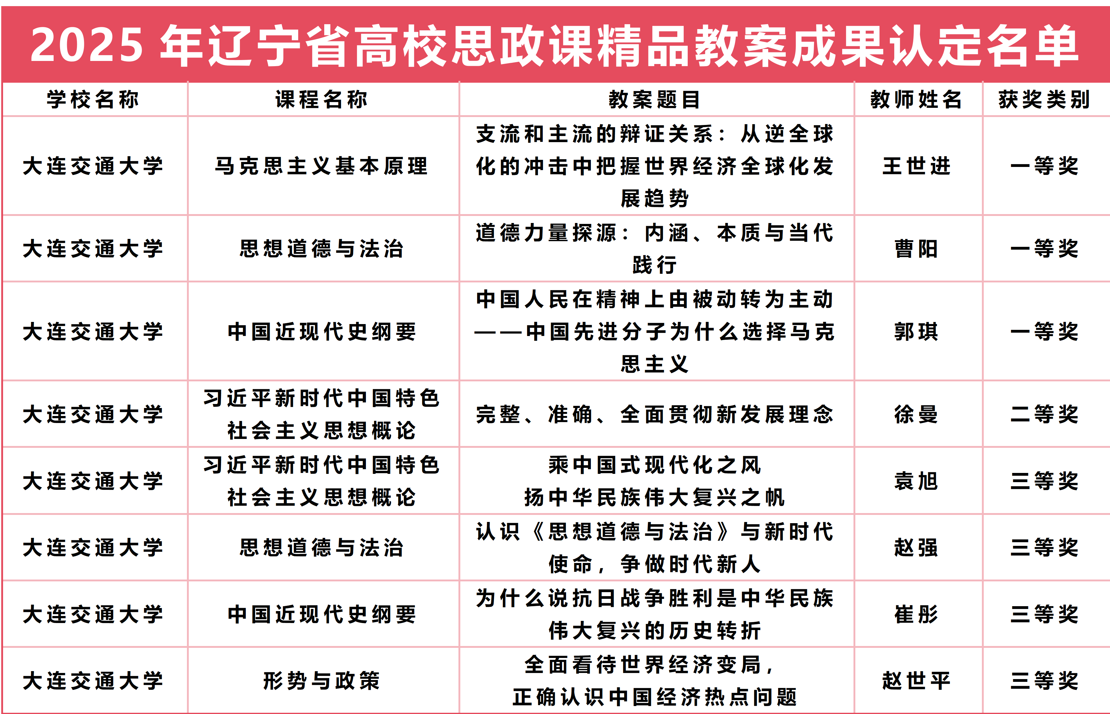 本次评选由辽宁省教育厅组织开展,是落实《以“四个一批”为抓手推进高校思政课建设工作方案》精神的重要举措,旨在以精品教案为示范引领,持续提升全省高校思政课教学质量。全省共评选出一等奖67项、二等奖128项、三等奖196项。