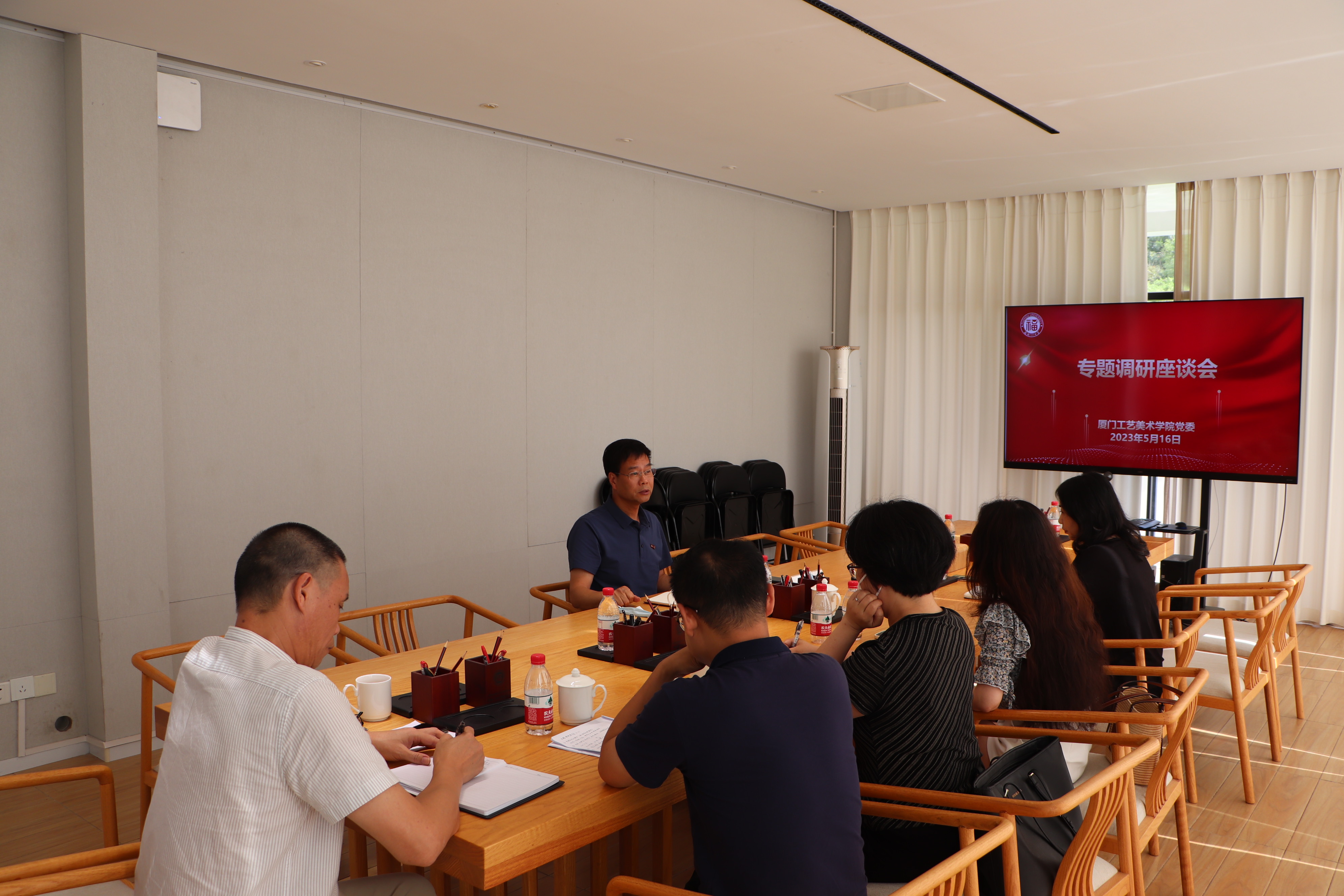 5月16日下午,厦门工艺美术学院党委李礼建书记在书瓦间组织召开专题调研座谈会,就如何加强与校本部其他学院进行交叉学科建设及党建与业务融合等进行专题座谈调研,学院环艺系、数媒系、工业系、产品系负责人及支部书记参加了调研座谈会。
