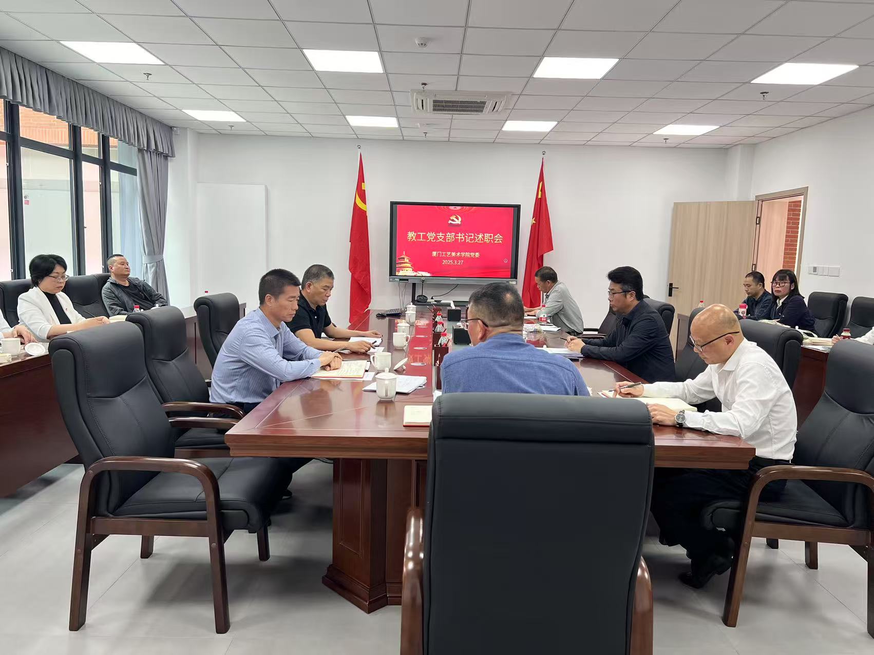 2025327午,厦门工艺美术学院党委在图展中心419会议室组织召开教工党支部书记述职会,14位教工党支部书记按抽签顺序依次进行2024年度党支部工作述职。学院党委林金强书记主持述职会,学院在校政班子成员、党委委员工会主席及党委组织员等参加了述职会并对支部书记、党支部工作进行了考核测评