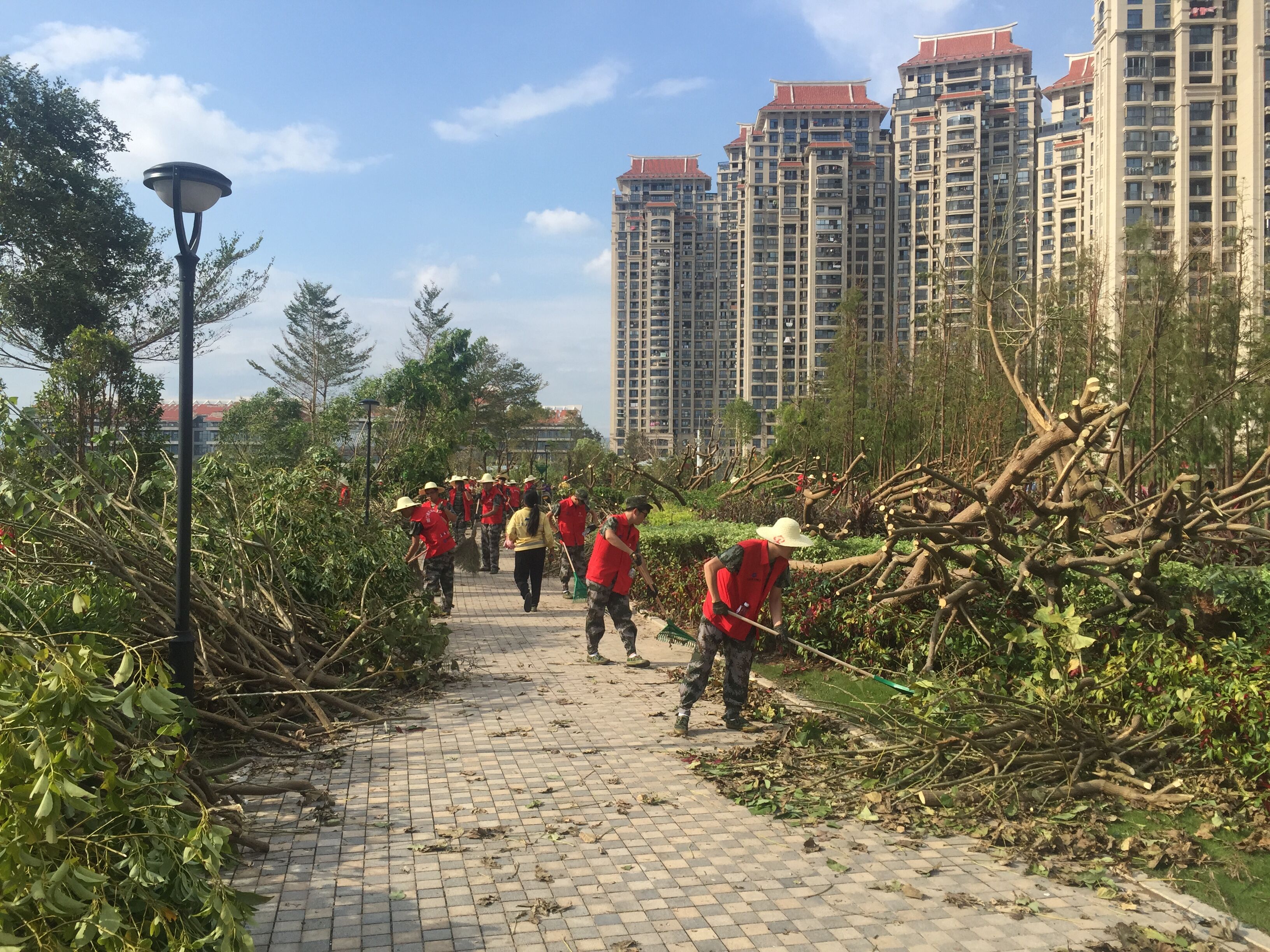 9月18日,我院团委响应集美区团区委的号召,召集180名学生志愿者参与集美区重建家园行动。我院学生身穿志愿者背心,头戴草帽,顶着烈日来到小区和集美万达附近,与环卫工人一道,将树木扶正,清扫道路。经过一个下午的努力,周围的环境有了明显的改善。明天,志愿者们还将继续清扫工作。