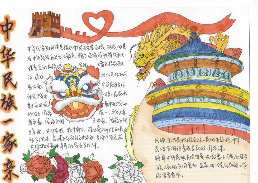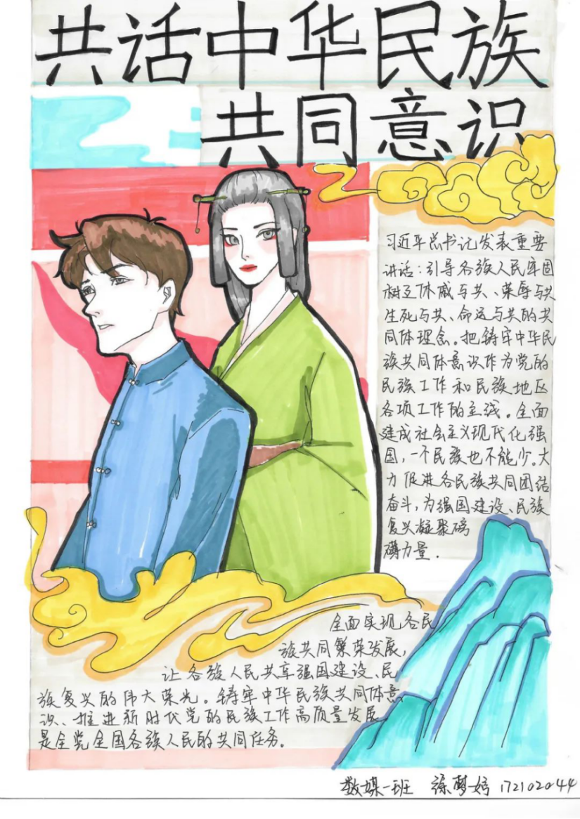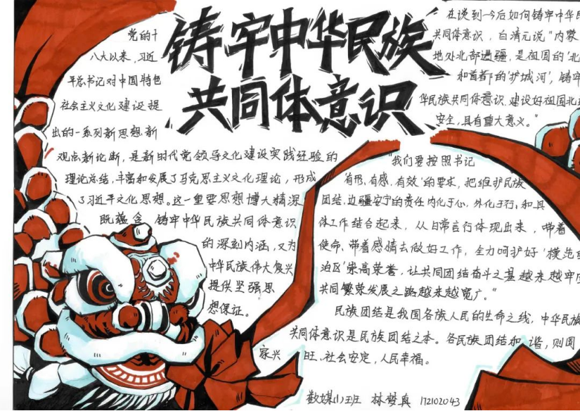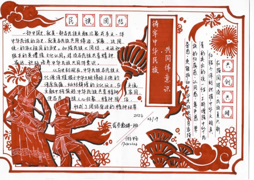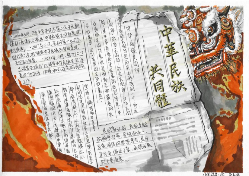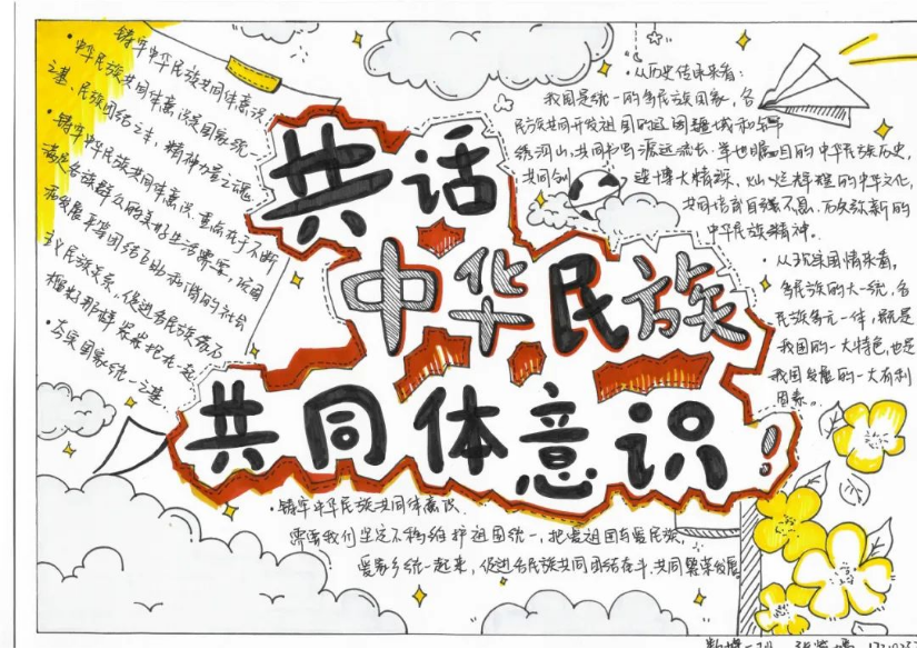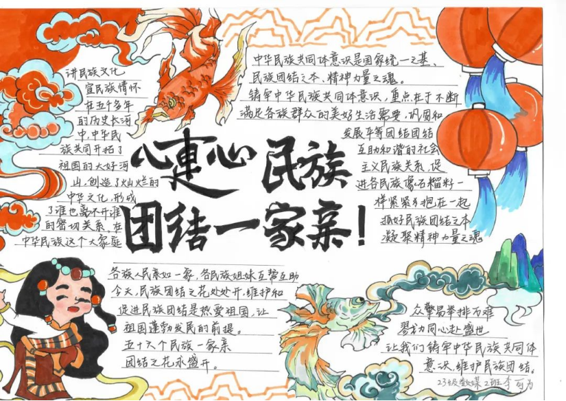 同学们以原创海报、手抄报以及漫画等形式表达对“中华民族共同体意识”的理解。海报设计富有创意,手抄报内容丰富多样,漫画精彩绝伦,每一幅作品都凝聚了同学们的心血和智慧。