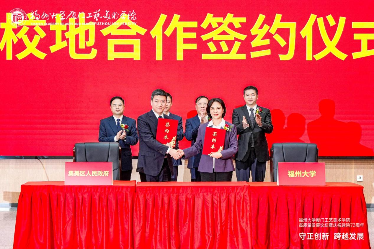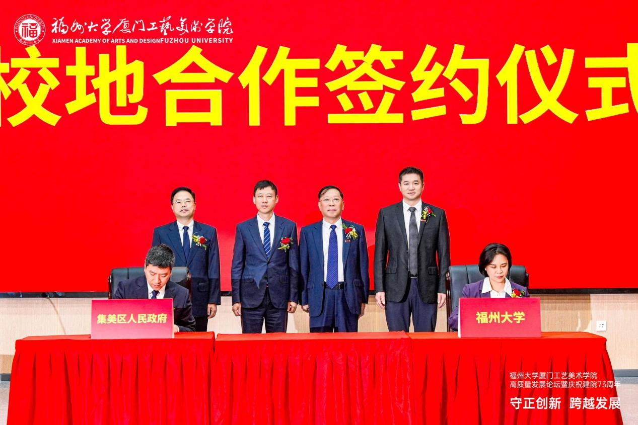 2025年11月18日上午,福州大学与厦门市集美区人民政府校地战略合作签约仪式在福州大学厦门图展中心鹭潮厅隆重举行。厦门市副市长季翔峰,福州大学党委书记陈国龙、校长吴明红院士,集美区委书记胡旭彬、区长倪杰,中国工程院院士、东南大学教授王建国,国际欧亚科学院院士、福建省人民政府顾问赵新力,厦门理工学院校长陈小辉,华侨大学副校长许志勇,厦门市文联副主席陈春洋,厦门市教育局副局长洪军,集美区副区长徐墩煌,清华大学美术学院原院长马赛教授,中国美术家协会漆画艺委会主任、厦门大学教授陈金华,国家社科基金艺术学重大项目首席专家、苏州大学博物馆馆长李超德教授,厦门市文化和旅游局原二级巡视员、福州大学中国漆画艺术研究院名誉院长叶细致,福建省直机关部处领导,厦门市、集美区有关部门领导,兄弟院校领导,福州大学机关部处领导,校友代表,厦门工艺美术学院领导及师生代表300多人出席仪式,共同见证这一重要时刻。仪式由福州大学党委常委、副校长、厦门校区管委会主任王心晨主持。