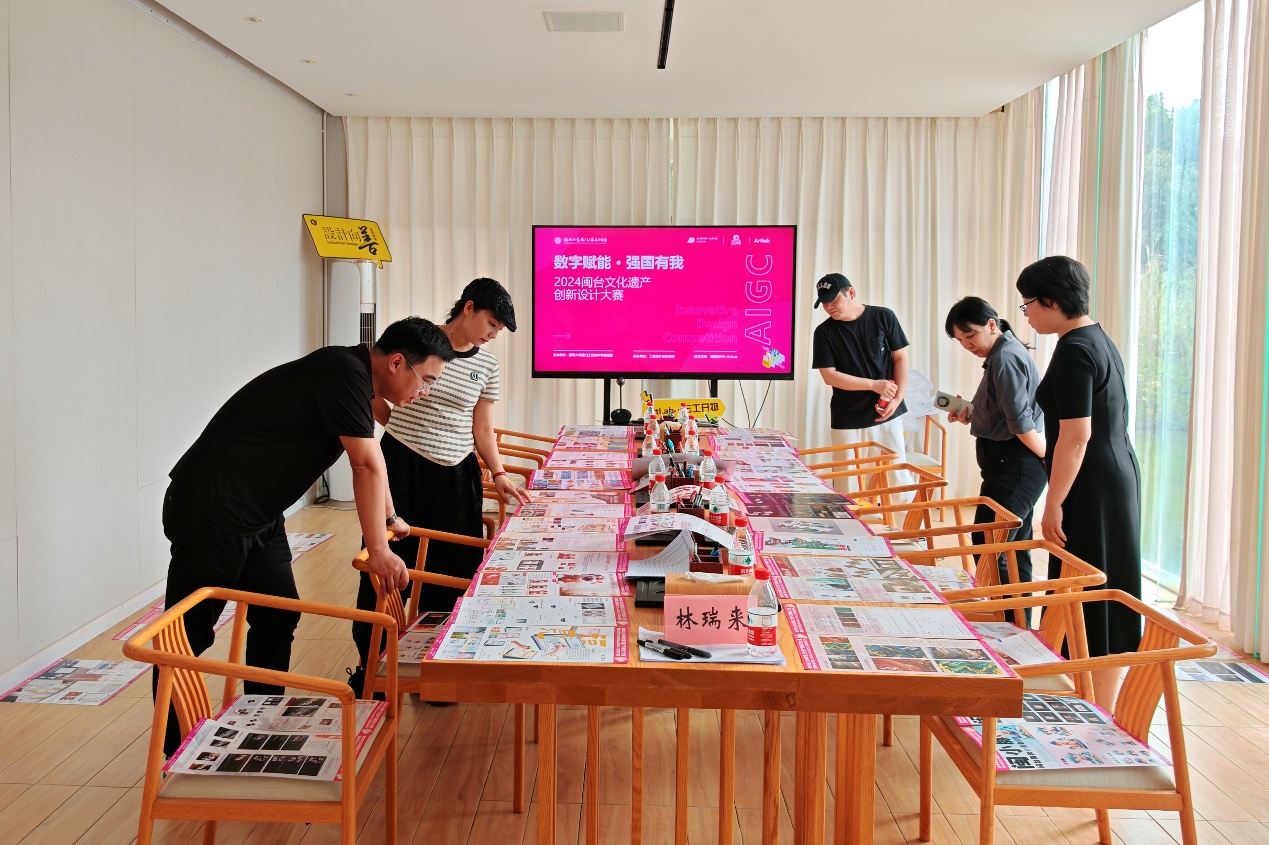 在短短不足两周的赛程之内,参赛者们探寻闽台民间艺术元素,运用 AIGC 技术为闽台传统文化遗产的传承与创新注入强劲动力,成功收获近百份参赛作品。这些融合精妙设计创意与前沿技术创新的产品、极具感染力的视觉艺术作品或别具一格的空间设计,淋漓尽致地展现出美院青年学子的卓越风貌与无限才华。2024年11月15日,秉持着公平、公正的理念与原则,本次大赛邀请来自学院团委、教务部门,以及工业设计系、视觉传达设计系、服装与服饰设计系的专家老师,齐聚书瓦间展开二轮评审工作。