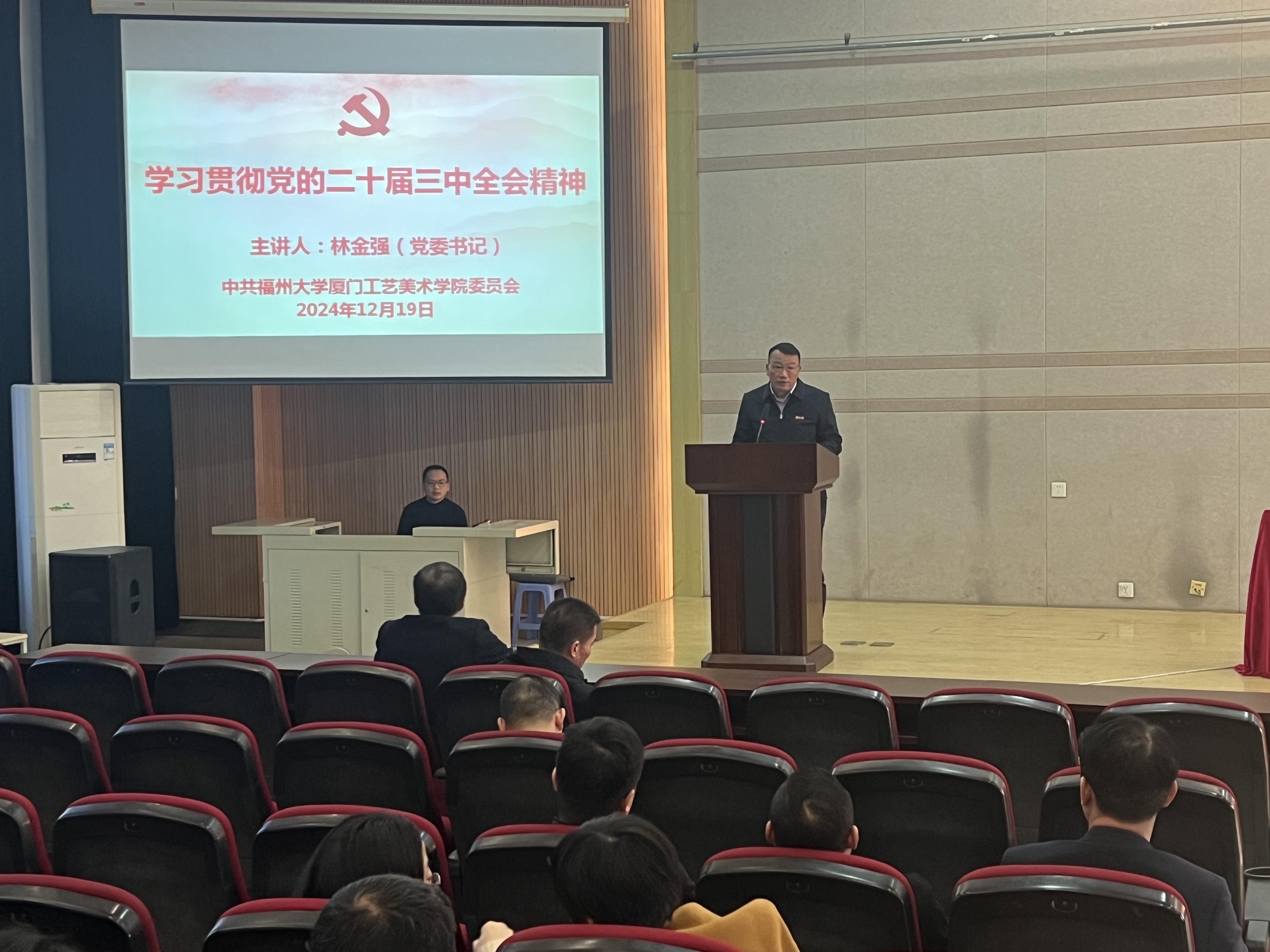 为深入学习习近平总书记在党的二十届三中全会上的重要讲话精神,深刻领会和把握进一步全面深化改革的主题、重大原则、重大举措、根本保证,深刻领悟“两个确立”的决定性意义,增强“四个意识”、坚定“四个自信”、做到“两个维护”,切实把全院师生的思想和行动统一到习近平总书记重要讲话精神上来,统一到党中央的部署要求上来,12月19日下午,厦门工艺美术学院党委在2号楼311报告厅举办学习贯彻党的二十届三中全会精神培训班暨党员教育培训班专题报告会。学院全体教职工和部分学生党员参加了线下会议、其余学生党员参加线上会议。