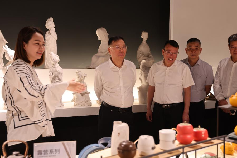 陈国龙书记一行首先来到厦门工艺美术学院82级陶瓷专业蔡万涯校友创办的万仟堂艺术品有限公司。在工作人员的讲解下,大家在堂展厅详细了解了每件作品的设计灵感、制作工艺以及背后的文化故事。参观结束后,众人在会议室展开座谈交流。创办人之女蔡天心向来访领导详细介绍了万仟堂的发展历程、品牌理念、产品布局以及未来规划。随后漳州窑素三彩瓷市级非遗传承人、同安窑珠光青瓷区级非遗传承人陈嫣校友汇报了窑素三彩瓷、珠光青瓷的由来,以及她们祖孙三代作为福三代对这两个非遗项目的复原之路和现代创新。陈国龙书记在总结发言中对蔡万涯校友为弘扬中华优秀传统文化、推动陶瓷产业转型升级作出了积极贡献给予充分肯定,对陈嫣校友一家保护传承非遗项目取得的成绩表示赞许。同时,他希望他们能为福大学子提供更多实习实践和就业机会,在人才培养、产学研合作等方面开展深度合作。