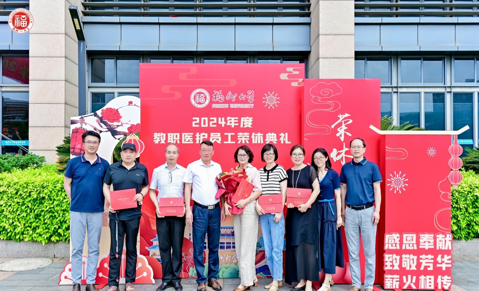 5月20日下午,2024年度福州大学教职医护员工荣休典礼在旗山校区图书馆博学厅举行。校党委陈国龙书记、郑煦林纪委书记、张亚雷副校长出席典礼,典礼由张亚雷副校长主持。(图)