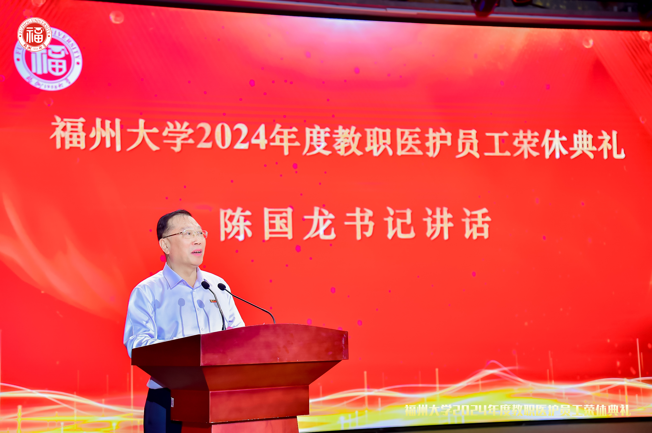 校党委书记陈国龙用“三个致敬”表达对全体荣休教职医护员工的崇高敬意。他代表学校向他们的教育情怀和责任担当致敬,向他们的高尚师德(医德)和无私奉献致敬,向他们的事业传承与精神守望致敬。陈国龙书记表示,过去一年,全校师生医护员工团结一致,学校各项事业取得长足的进步,实现了“十项重大突破”,其中之一就是福州大学在医学教育新赛道迈出坚实步伐。他希望荣休教职医护员工退休不退志、离岗不离心、卸任不卸责,一如既往地关心和支持学校事业发展、引领和帮扶青年成长、讲好和传播福大故事,让福州大学“三种精神”薪火相传。同时,他希望全校师生要积极支持离退休工作,从政治、思想、生活、精神等各方面关心关爱荣休教职医护员工,让他们在政治上有荣誉感、组织上有归属感、生活上有幸福感。