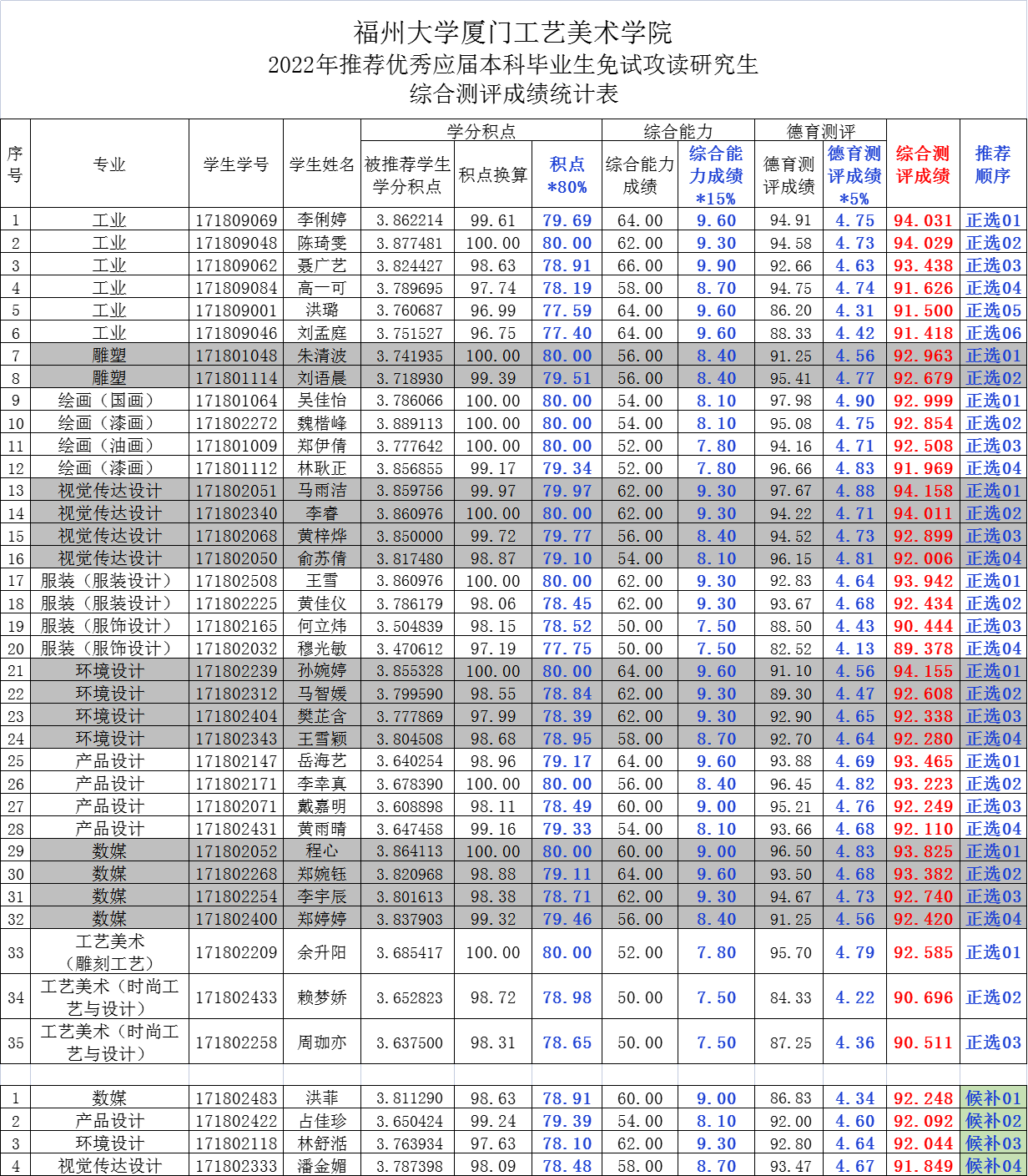 根据《福州大学推荐优秀应届本科毕业生免试攻读研究生工作实施办法(2018年修订)》(福大研〔2018〕38号)、《关于做好我校2022年推荐优秀应届本科毕业生免试攻读研究生工作的通知》和《福州大学厦门工艺美术学院2022年推荐优秀应届本科毕业生免试攻读研究生实施细则》等文件要求,根据报名情况,院推免生遴选工作领导小组会议研究确定,李俐婷等35名同学获得我院2022年推荐优秀应届本科毕业生免试攻读研究生初选资格,洪菲等4名同学获得推荐候补资格,具体名单详见附件。