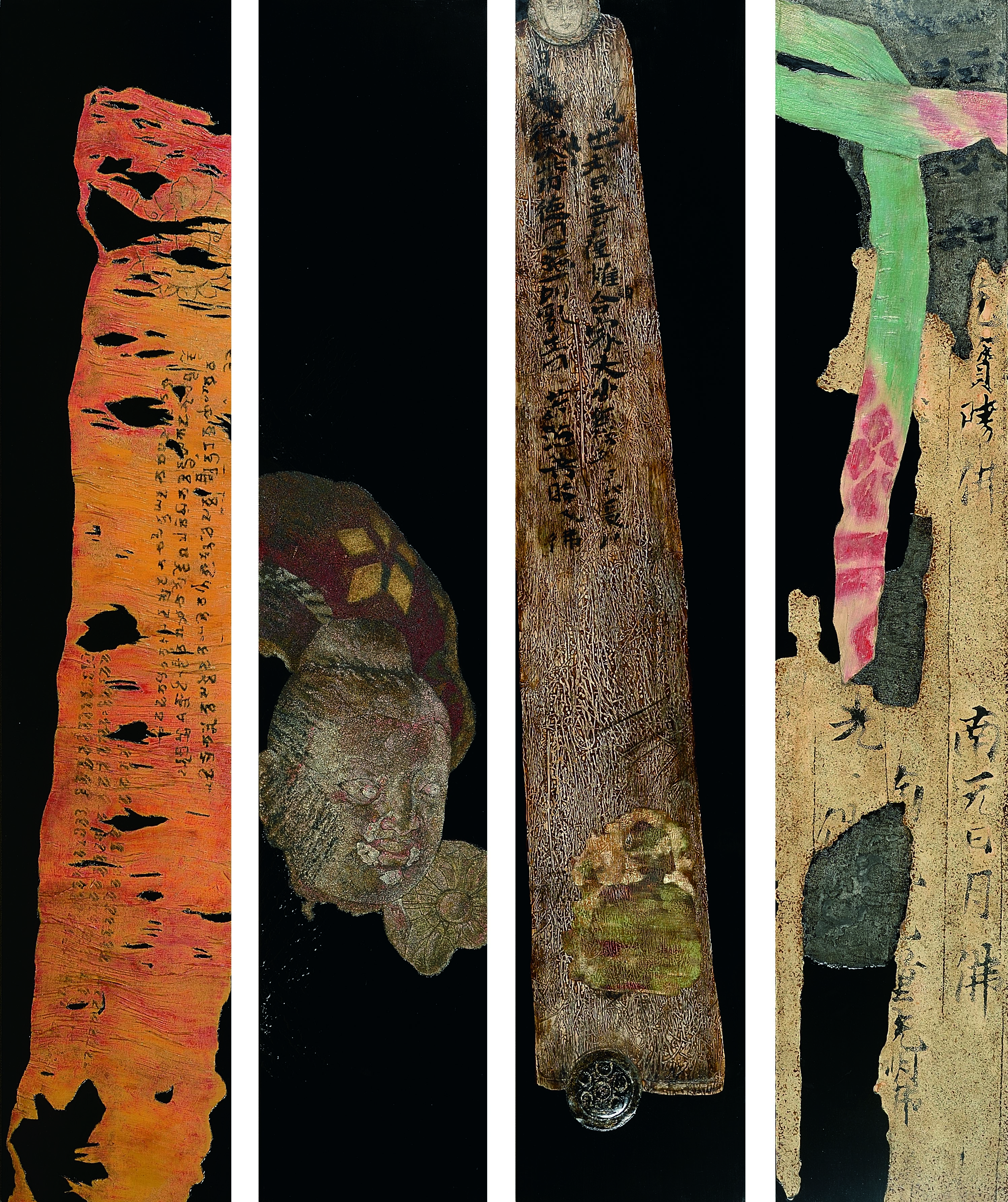 漆画《丝路•对语No2》,获第五届全国漆画展(入会资格),中国美术馆收藏,尺寸:180cm乘140cm,2021年
