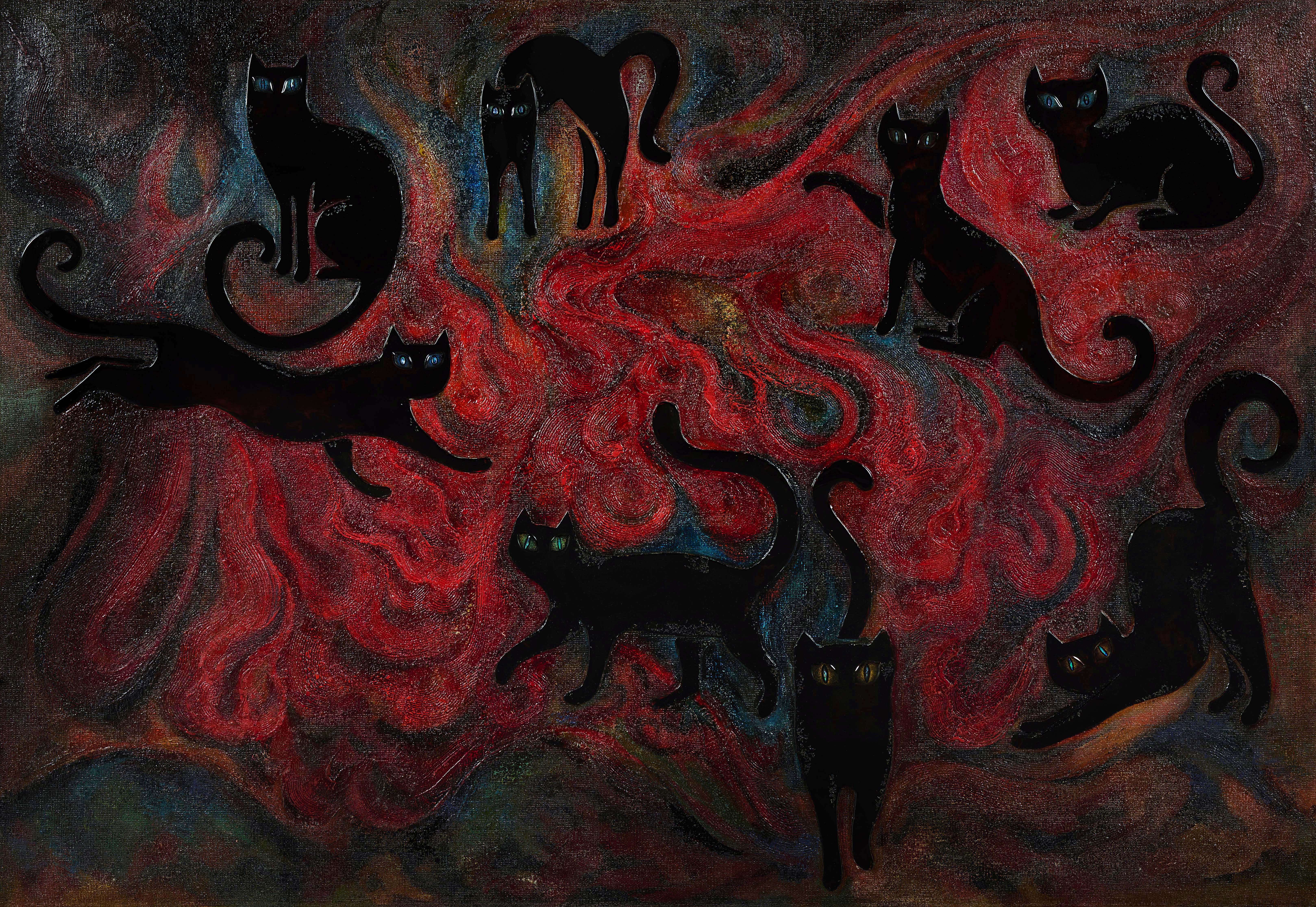 漆画《锦衾暖狸奴》,尺寸:160X120cm,2023年