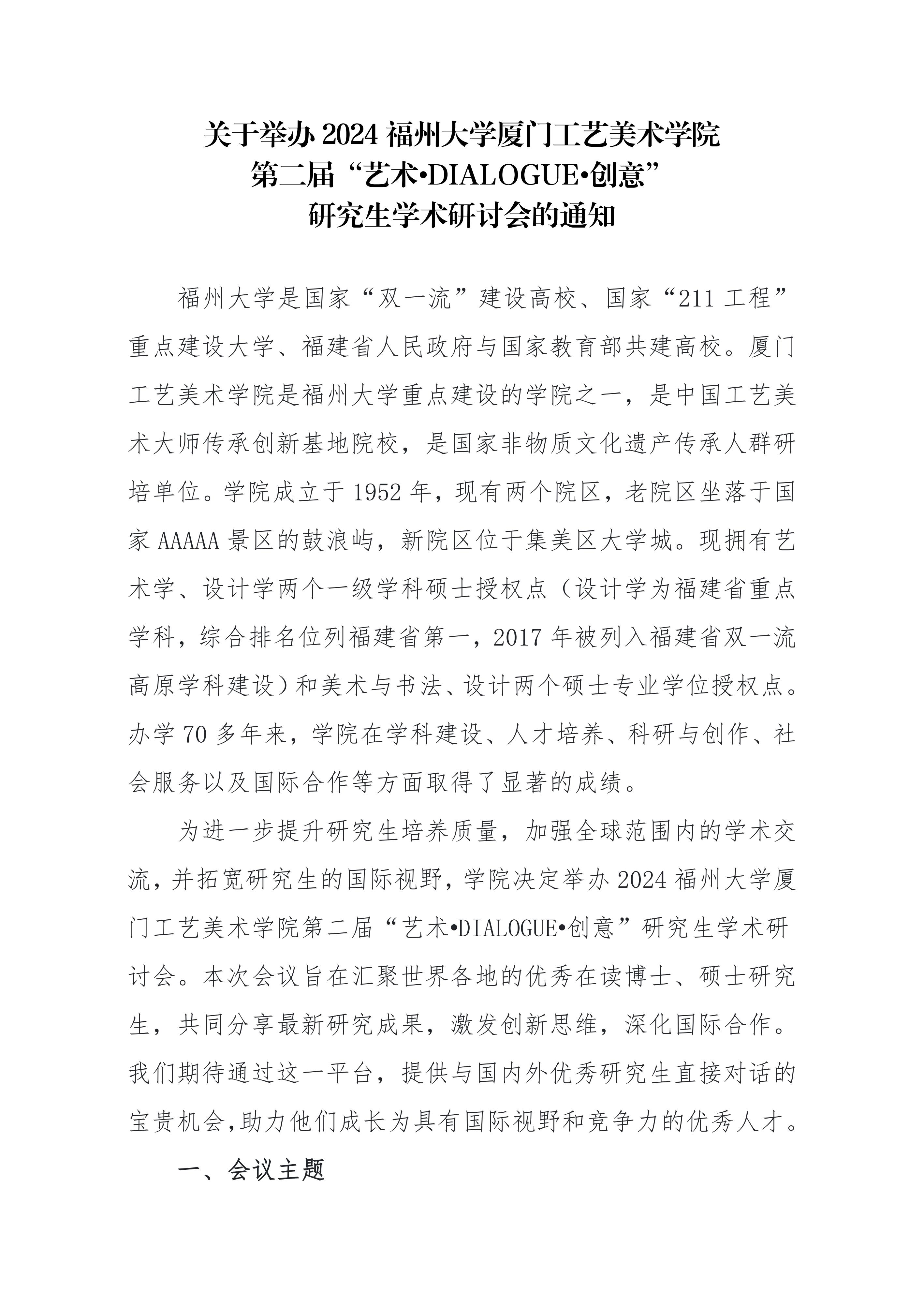 关于举办 2024 福州大学厦门工艺美术学院 第二届“艺术•DIALOGUE•创意” 研究生国际学术研讨会的通知