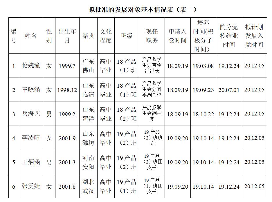 为了加强对发展党员工作的民主监督,确保发展新党员的质量,现将入党积极分子伦婉潼等6位同志的有关情况进行公示(详见《拟批准的发展对象基本情况表》),公示期10月19日至10月25日止。有异议者,可向学院党委反映。
