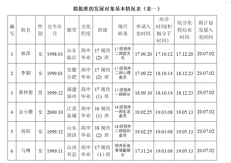 为了加强对发展党员工作的民主监督,确保发展新党员的质量,现将入党积极分子林萍等6位同志的有关情况进行公示(详见《拟批准的发展对象基本情况表》),公示期6月06日至6月12日止。有异议者,可向学院党委反映。