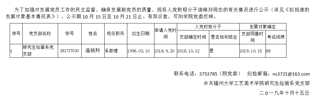 关于拟批准温晓羚同志为党的发展对象的公示书