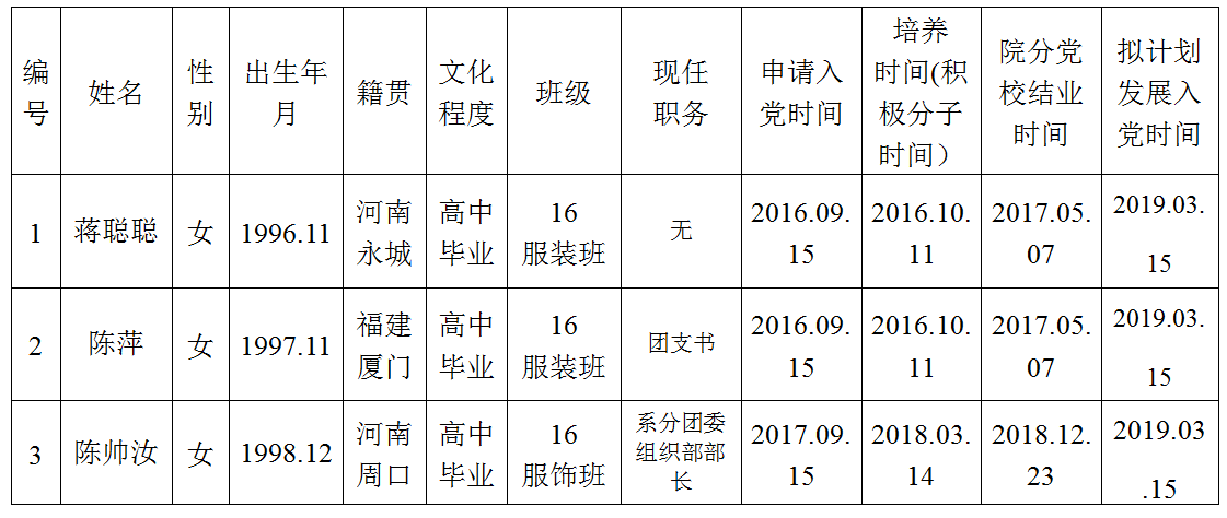 关于拟批准蒋聪聪等三位同志为党的发展对象的公示书