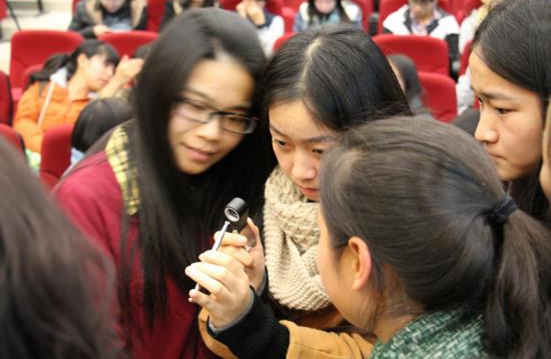 骆婷婷女士首先以“什么是爱?”和“什么会让你感到幸福?”开始了这场充满爱的演讲。现场气氛热烈,同学们都积极的参与问答与互动。听完演讲并亲身体验后的同学们都一致认为受益匪浅,不少同学都表示出对珠宝设计的浓厚兴趣,愿意进一步学习珠宝知识。