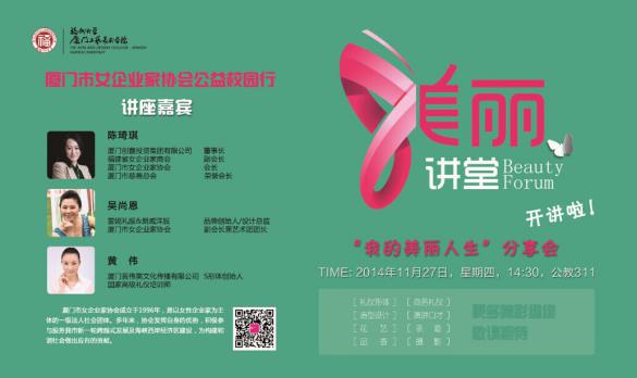 2014年11月28日下午,院团委校园文化新品牌“美丽讲堂”第一讲“我的美丽人生”暨厦门市女企业家协会公益校园行,在我院2号教学楼311报告厅成功开讲。