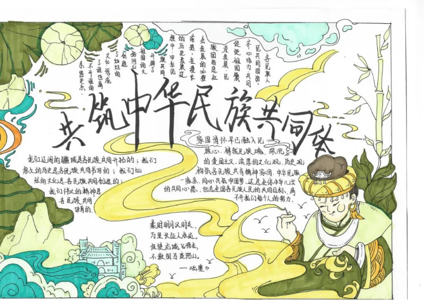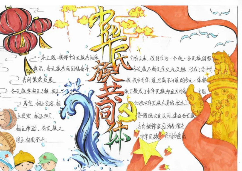 同学们以原创海报、手抄报以及漫画等形式表达对“中华民族共同体意识”的理解。海报设计富有创意,手抄报内容丰富多样,漫画精彩绝伦,每一幅作品都凝聚了同学们的心血和智慧。