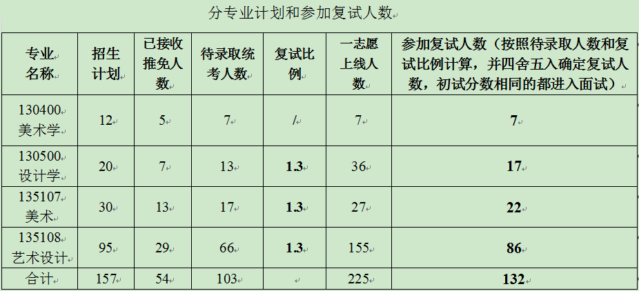 原则上按专业实行差额复试,复试比例为1:1.3,参加复试人数按照待录取人数×复试比例计算,并四舍五入,初试分数相同者都进入面试。美术学一志愿合格生源等于招生计划,先复试一志愿考生,复试后若出现不合格情况,再做计划调整。(具体待通知)