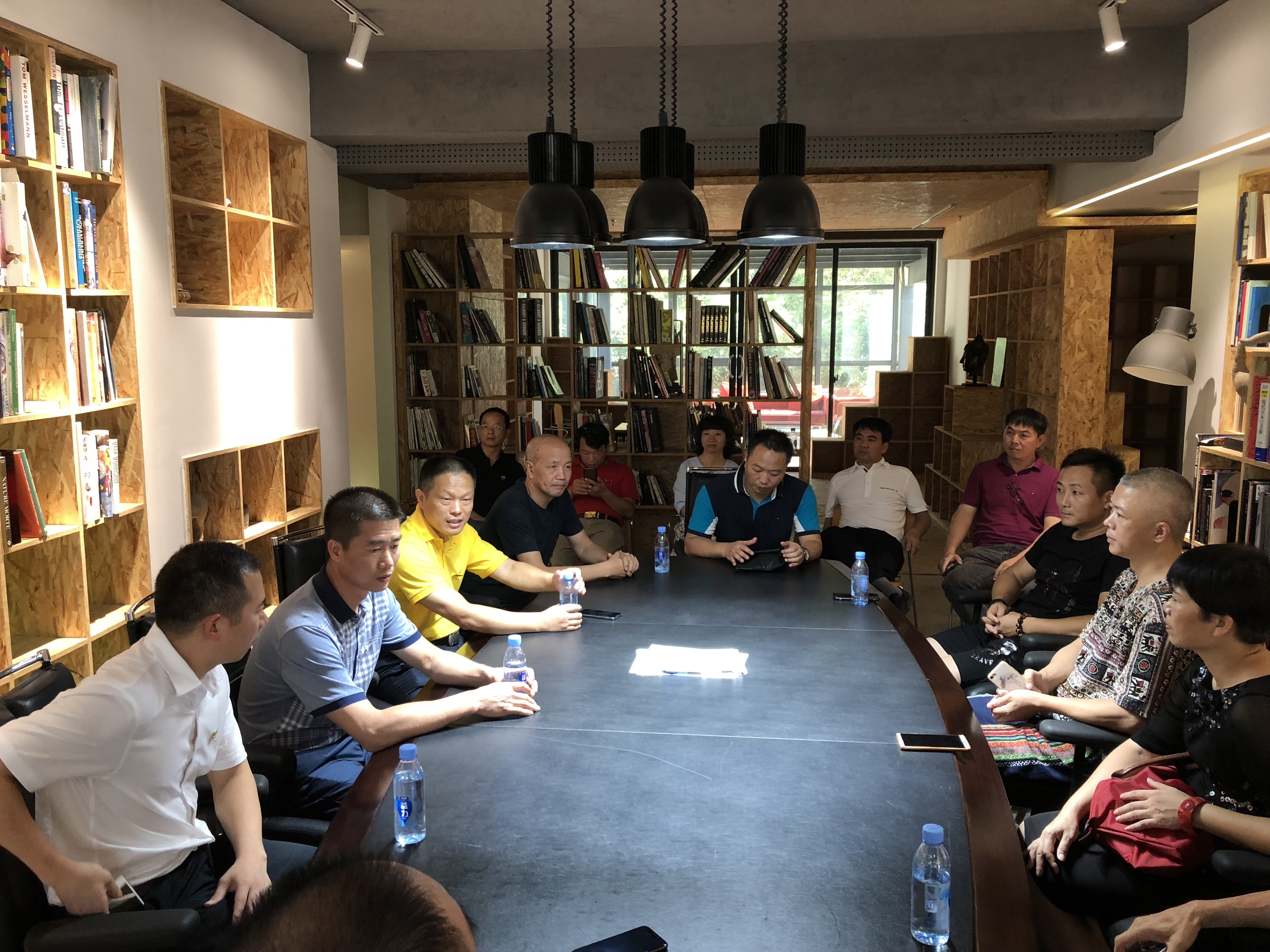 随后,黄阿火书记一行参观了94届校友林慧的“锡师傅”工作室,赞叹其发扬并创新传统手工艺。紧接着来到了81届校友王建国的谷见美术馆,此时已有近二十名泉州校友汇集在此等候,院领导与校友们进行了座谈交流,王国建校友将自己近期的作品拿出与大家分享。