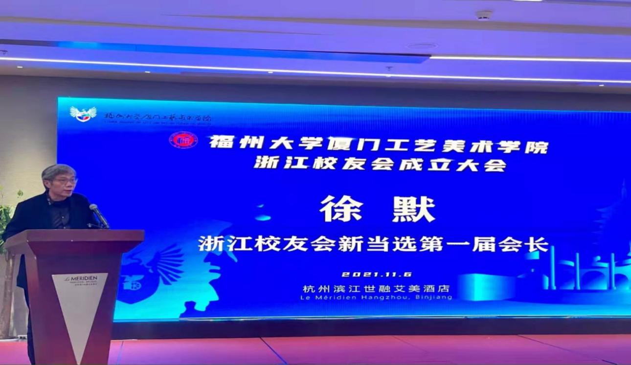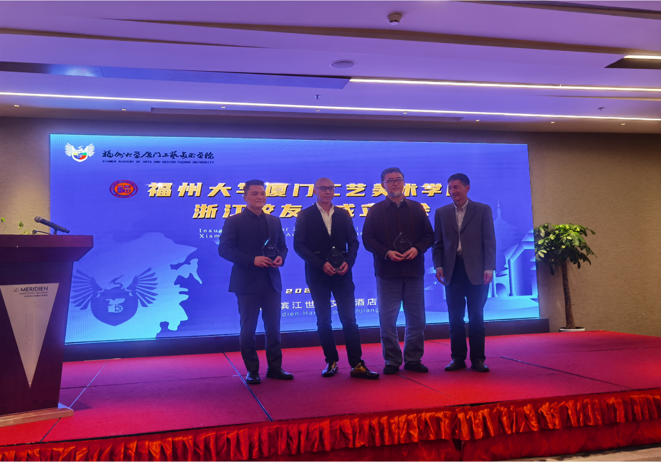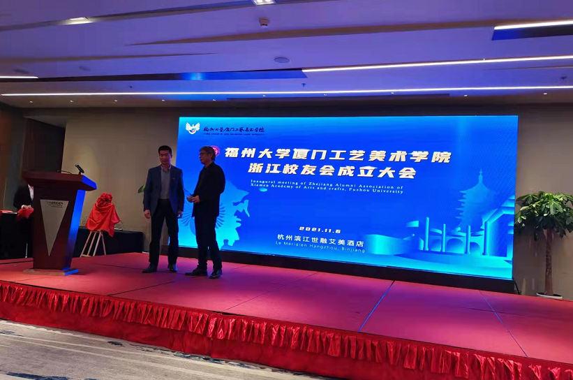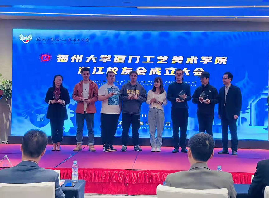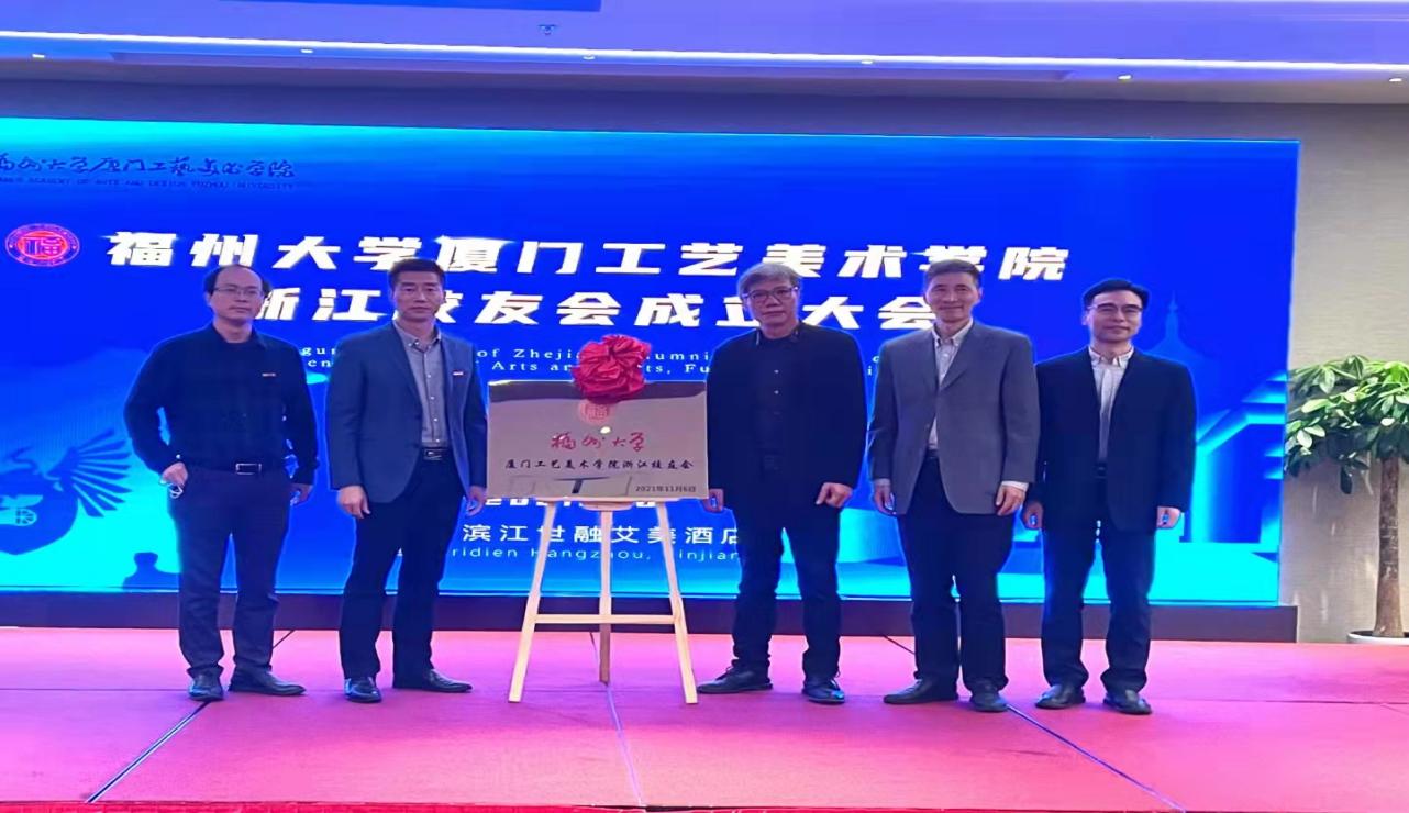 会议中学院浙江校友会代表易敏哲做了发言,学院广东校友会监事长林金舜校友介绍广东校友会情况,期待两地校友会今后加强沟通交流。会议最后,福州大学厦门工艺美术学院林旭副书记、福州大学浙江校友会陈一宁会长、福州大学厦门工艺美术学院浙江校友会徐默会长、福州大学厦门工艺美术学院院办校友办郑青主任、福州大学浙江校友会秘书长陈浩然共同为福州大学厦门工艺美术学院浙江校友会成立揭牌,福州大学厦门工艺美术学院浙江校友会正式成立。
