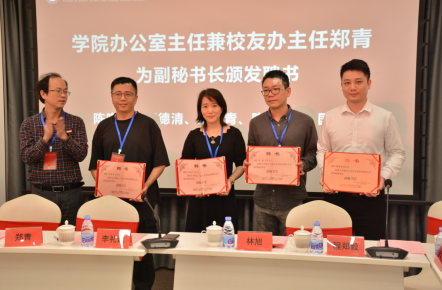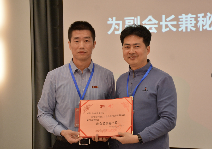 会议选举产生了福州大学厦门工艺美术学院福州校友会第四届理事会成员。王晓明、黄宝庆担任名誉会长,陈争鸣担任会长,叶凌、刘剑荣担任常务副会长,黄丽娟、杨小河、上官俊华、叶林心、郭禹宏、张光华、林善传、林滨、朱光、叶斌、陈国勇、丁祥永、杨日伟担任副会长,陈国勇兼任秘书长,陈晓文、高德清、吴海青、陈凯、郭国明、黄丹丹、王其堂、林妙岚、陈凤炆、樊煜担任副秘书长。随后李礼建书记、林旭副书记、郑青主任为新一届理事成员颁发证书。