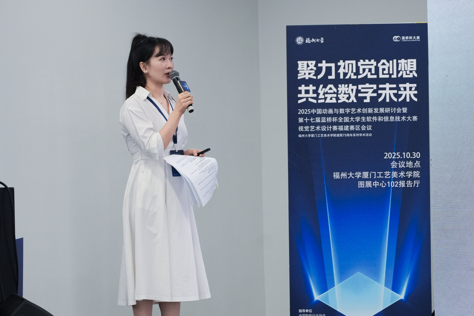 2025年10月30日上午,中国动画与数字艺术创新发展研讨会暨第十七届蓝桥杯全国大学生软件和信息技术大赛视觉艺术设计赛福建赛区会议,在福州大学厦门工艺美术学院集美校区图展中心102学术报告厅顺利举行。本次会议由福州大学、蓝桥杯全国软件和信息技术专业人才大赛组委会联合主办,福州大学厦门工艺美术学院、福建省美术家协会动漫艺委会联合承办,中国软件行业协会指导。