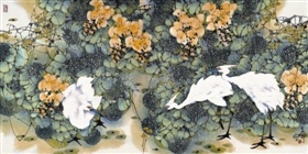 这幅《青山绿水白鹭归》,长136、宽68厘米。画面中,三只白鹭悠闲地在藤萝类植物中栖息,周围黄花点缀,让观者感觉就像来到了山间原野,倾听声声婉转的鸟语,嗅闻阵阵馥郁的花香。画中的白鹭羽毛蓬松,眼睛传神,刻画入微,透出一股清新空灵之感。此幅作品精致处愈见其工,写意处用笔洒脱而不失含蓄蕴藉,充分体现了郑景贤花鸟画艺术在新时代与时俱进、朝气蓬勃的生命力。