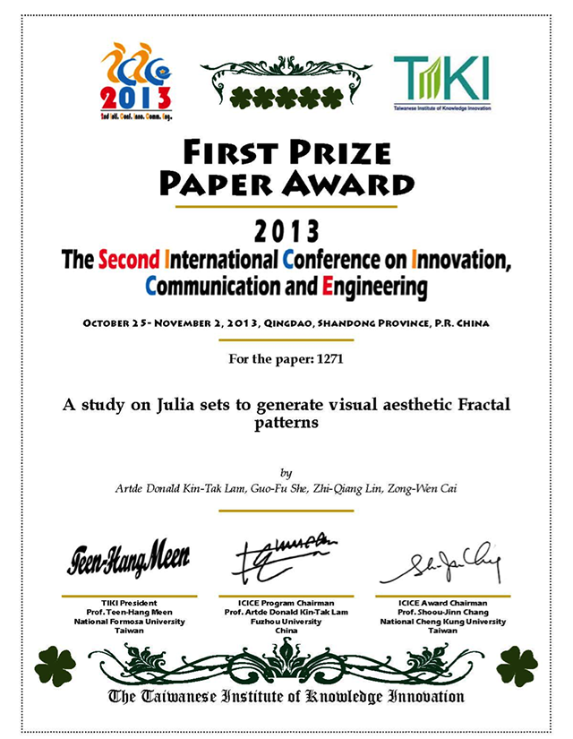 我院林志强教授、佘国富教授的论文《关于Julia集的分形图案的视觉审美研 究》入选ICICE 2013研讨会论文集(ISBN 978-1-138-00117-6 ,152P),并获得优秀论文一等奖。此次获奖是我院的在学 术研究领域的获得优异的成绩,是我院鼓励发展研究型教学的进步。