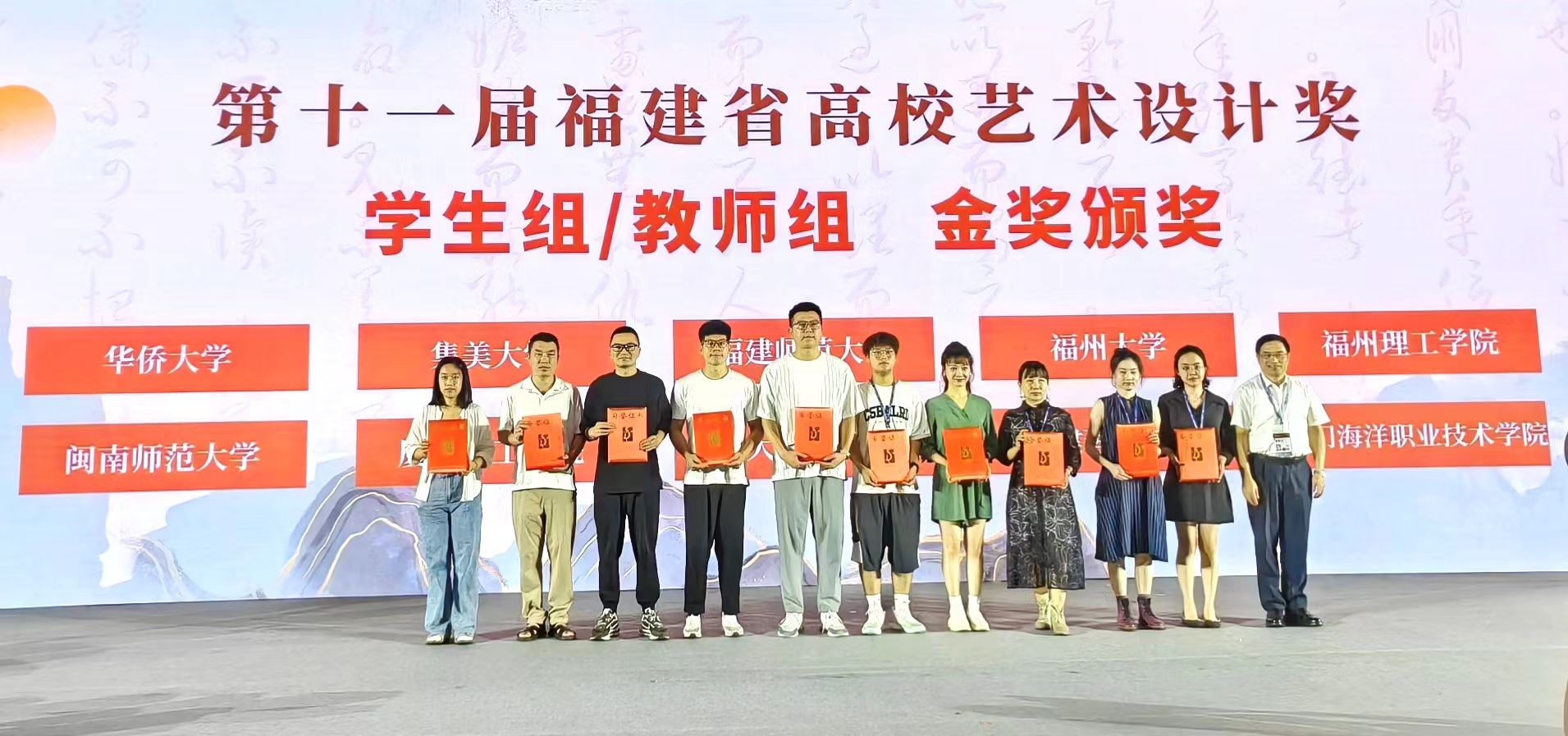 其中,由福建省教育厅主办的第十一届福建省高校艺术设计奖围绕『传承红色基因 赓续精神血脉』主题,通过征集评选、创意活动、推介对接、论坛沙龙等形式,打造推动海峡两岸艺术设计教育事业发展的重要平台和活动品牌。8月4日下午,颁奖典礼于文博会展馆内举行,福州大学厦门工艺美术学院共获得2金6银4铜,共12个奖项。