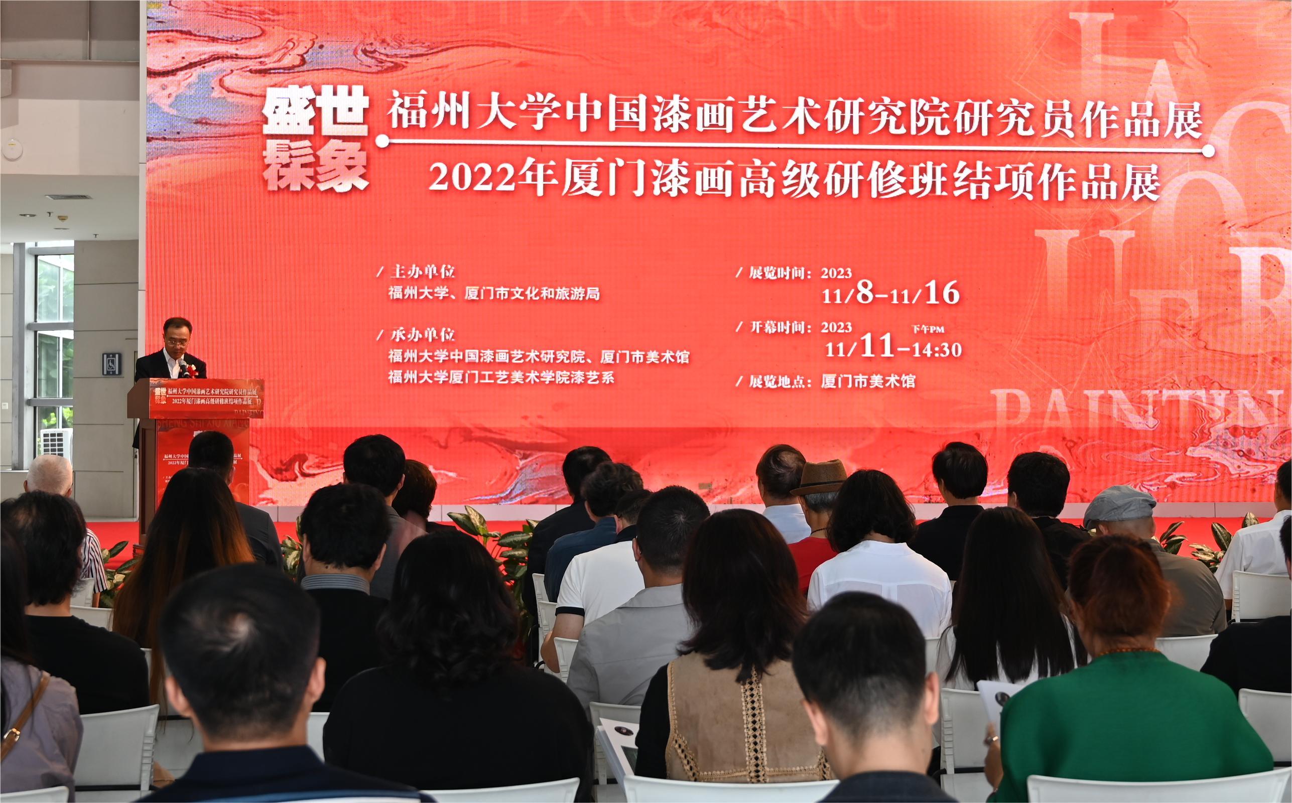 厦门市文化和旅游局魏峰副局长在致辞中总结了二十余年间,厦门在中国现代漆画发展中的作用与地位,并强调漆画已成为厦门最有优势的画种与文化品牌,厦门市文旅局将一如既往的支持漆画事业发展。同时他表示福州大学中国漆画艺术研究院和福州大学厦门工艺美术学院应当更好地发挥高校学科平台的引领作用,进一步推动中国漆画艺术的高质量发展。