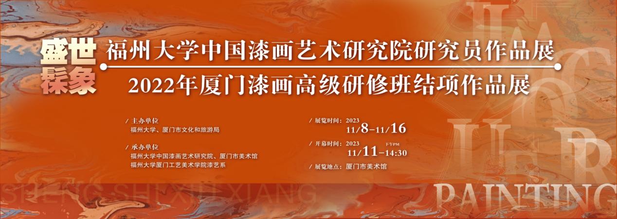 2023年11月11日下午,《盛世髹象》——福州大学中国漆画艺术研究院研究员作品展暨2022年厦门漆画高级研修班作品展在厦门美术馆隆重举行。本次展览由福州大学、厦门市文化和旅游局联合主办,福州大学中国漆画艺术研究院、厦门市美术馆、福州大学厦门工艺美术学院漆艺系共同承办。经一年的筹备,二展合一,展览围绕“盛世髹象”为主题,旨在表达新时代的气象与脉搏,讴歌中国盛世伟业,反映社会进步、文化繁荣、人民幸福、生态良好与新时代的优秀成果,集中展现中国现代漆画艺术发展的时代精神与风貌,为实现推动中国漆画事业的高质量发展而助力。展览时间:2023年11月8日——11月16日。