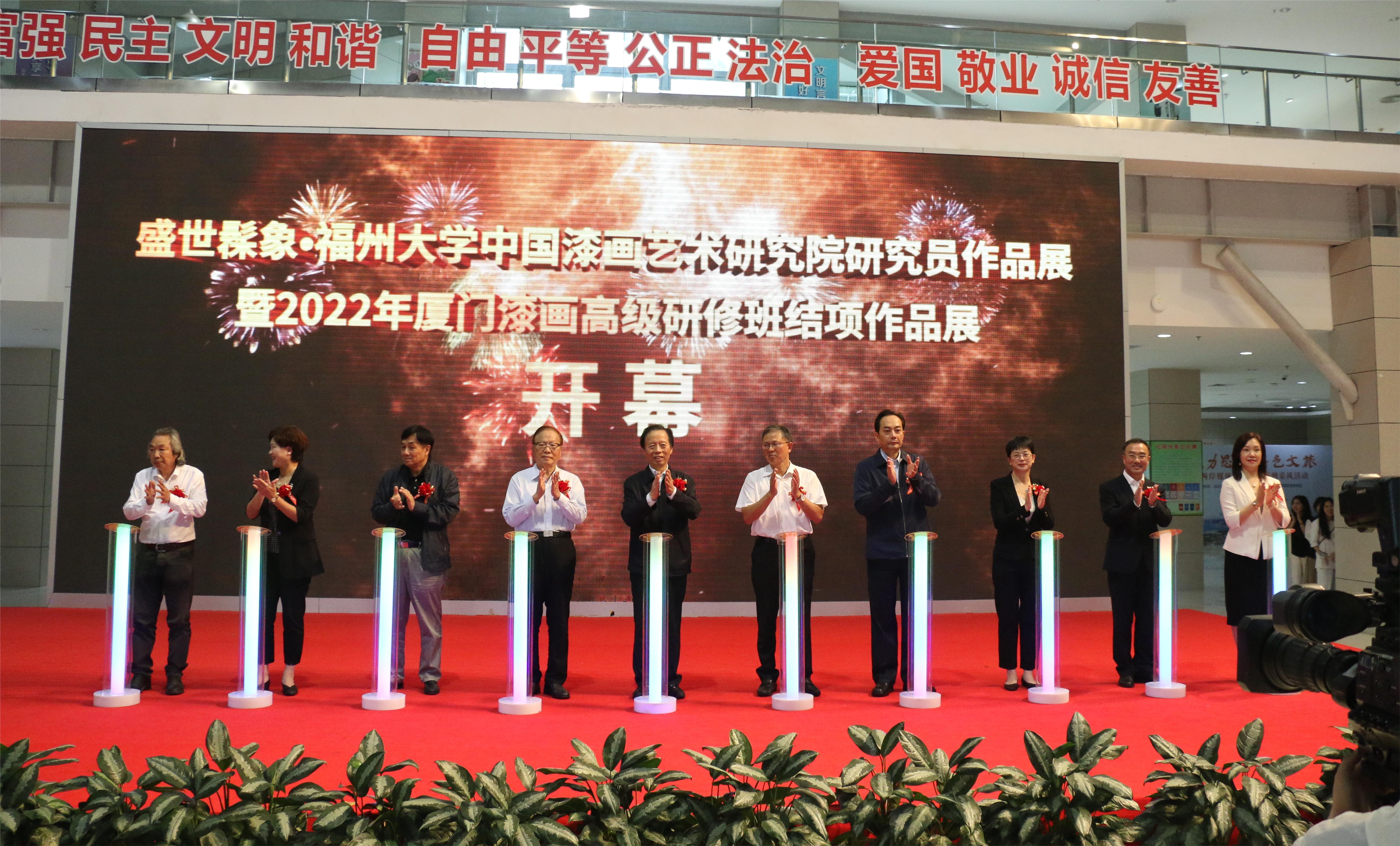 展览开幕式由福州大学厦门工艺美术学院副院长张健教授主持,出席本次展览开幕式的领导和嘉宾有:文化部原副部长、中国艺术研究院原院长王文章,厦门市政协薛祺安副主席,厦门市委原副书记吴凤章,福建省文化厅原厅长、闽台历史文化研究院院长陈秋平,厦门市委原秘书长徐模,厦门市文化和旅游局局长黄碧珊,厦门市委宣传部副部长欧阳丽娟,福州大学原党委常委、副校长林键,厦门市文化和旅游局副局长魏峰,厦门市文联副主席苏璇,厦门市闽南文化研究会会长叶细致,集美区文联主席何庆余,厦门大学艺术学院常务副院长吴荣华,福州大学厦门工艺美术学院党委书记李礼建,福州大学厦门工艺美术学院院长、福州大学中国漆画艺术研究院执行院长刘玉龙,福州大学厦门工艺美术学院原常务副院长、福州大学中国漆画艺术研究院副院长佘国华,中国美协漆画艺委会主任、福州大学中国漆画艺术研究院院长陈金华,中国美协漆画艺委会副主任、秘书长、厦门大学艺术学院教授汤志义,中国美协漆画艺委会副主任、清华大学美术学院教授程向军,中国美协漆画艺委会副主任、江西省美协原主席王向阳,中国美协漆画艺委会原委员、十一届全国政协委员陈立德,中国美协漆画艺委会原委员、福州大学工艺美术学院教授吴嘉诠,中国美协漆画艺委会副秘书长、鲁迅美术学院教授张泽国,中国美协漆画艺委会委员、广东美协漆画艺委会主任苏星,中国美协漆画艺委会委员、闽江学院美术学院院长金晖,中国美协漆画艺委会委员、福州大学厦门工艺美术学院漆艺系苏国伟主任,中国美协漆画艺委会委员、厦门大学艺术学院美术系张玉惠副主任,以及来自北京长阳文化产业园董事长杨昆等。此外,还有来自福建省美术家协会漆画艺委会的全体委员和2022厦门漆画高级研修班的全体学员,以及来自各院校的师生代表和各位媒体朋友。