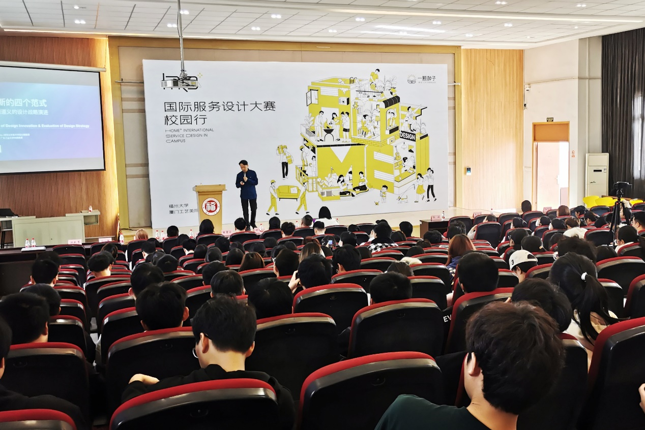 2023年11月29日, HOME+ 国际服务设计大赛校园行首站于我福州大学集美校区顺利举办。清华大学美术学院蔡军教授,江南大学设计学院董玉妹老师,一颗种子基金联合发起人、好慷在家联合创始人郑森隆,一颗种子基金会常务理事长郭文卿,好慷在家设计总监柯友奖,HOME+ 赛事组委会理事陈震宏、2023 HOME+ 设计大赛金奖团队代表江南大学吴凯丰、黄欣怡,以及福州大学厦门工艺美术学院副院长张健教授、党政办张友恭主任、教务科田合伟科长、陈波老师,和来自我院工业设计系、环境设计系、视觉传达系、数字媒体艺术等不同系所的师生代表,以及华侨大学、厦门理工学院等兄弟院校的师生,约300人出席了相关的开幕仪式。活动由福州大学厦门工艺美术学院工业设计系主任洪歆慧副教授主持。