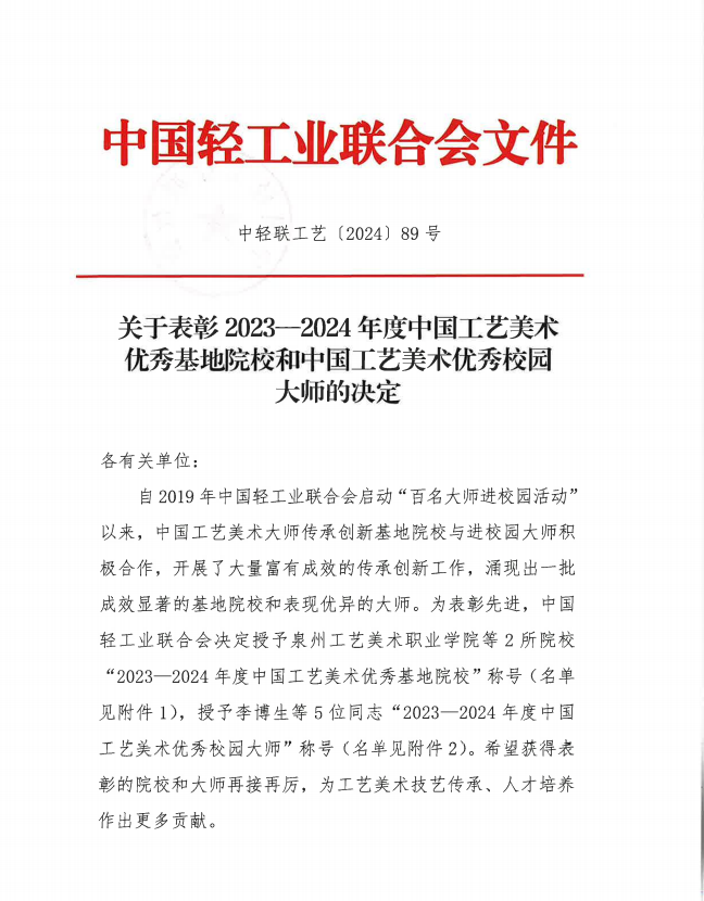 2024年4月26日中国轻工联合会发布《关于表彰2023--2024年度中国工艺美术优秀基地院校和中国工艺美术优秀校园大师的决定》(中轻联工艺[2024]89号),福州大学厦门工艺美术学院郑幼林老师因表现优异受到表彰,荣获“2023--2024年度中国工艺美术优秀校园大师”称号。全国仅有5名同志获此表彰。希望郑幼林老师再接再厉,为工艺美术技艺传承、人才培养作出更多贡献。