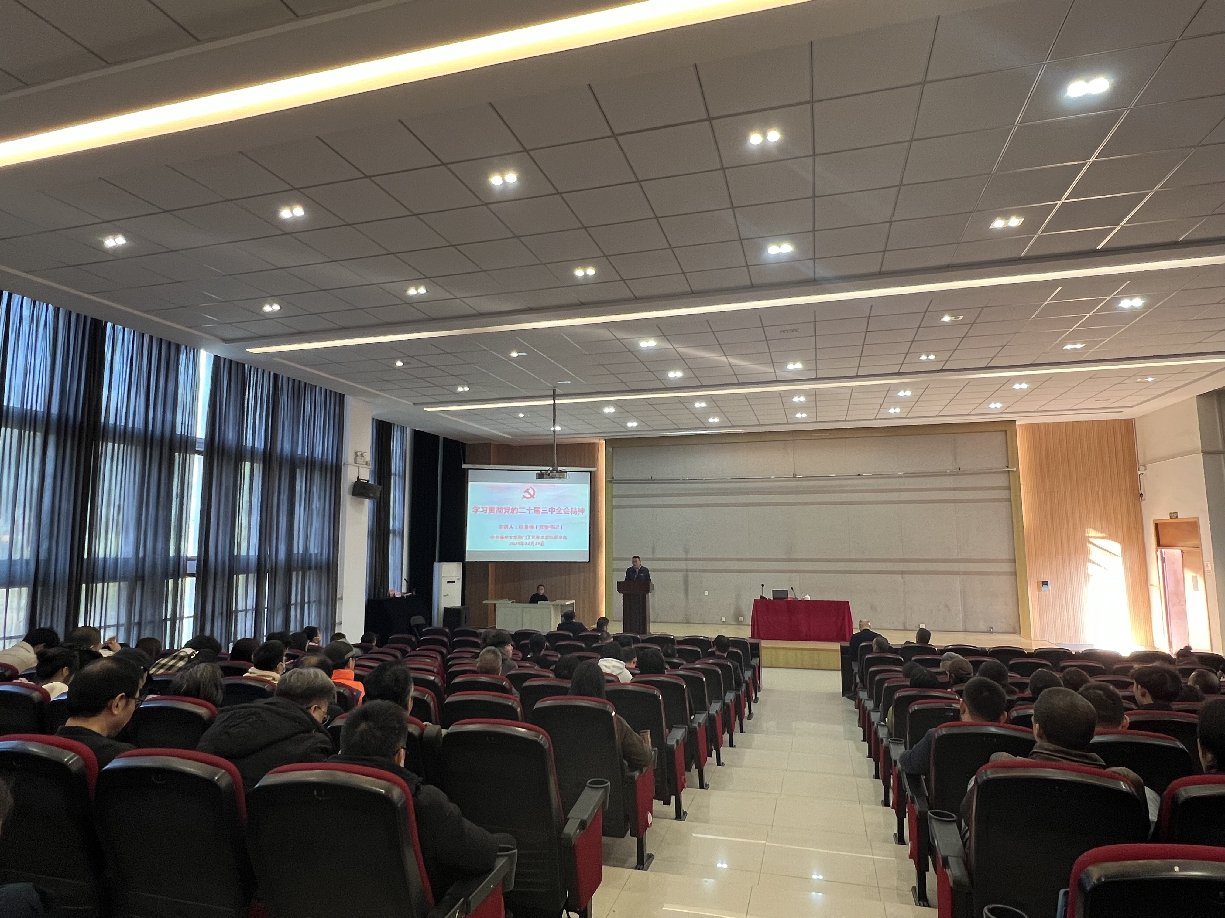 为深入学习习近平总书记在党的二十届三中全会上的重要讲话精神,深刻领会和把握进一步全面深化改革的主题、重大原则、重大举措、根本保证,深刻领悟“两个确立”的决定性意义,增强“四个意识”、坚定“四个自信”、做到“两个维护”,切实把全院师生的思想和行动统一到习近平总书记重要讲话精神上来,统一到党中央的部署要求上来,12月19日下午,厦门工艺美术学院党委在2号楼311报告厅举办学习贯彻党的二十届三中全会精神培训班暨党员教育培训班专题报告会。学院全体教职工和部分学生党员参加了线下会议、其余学生党员参加线上会议。