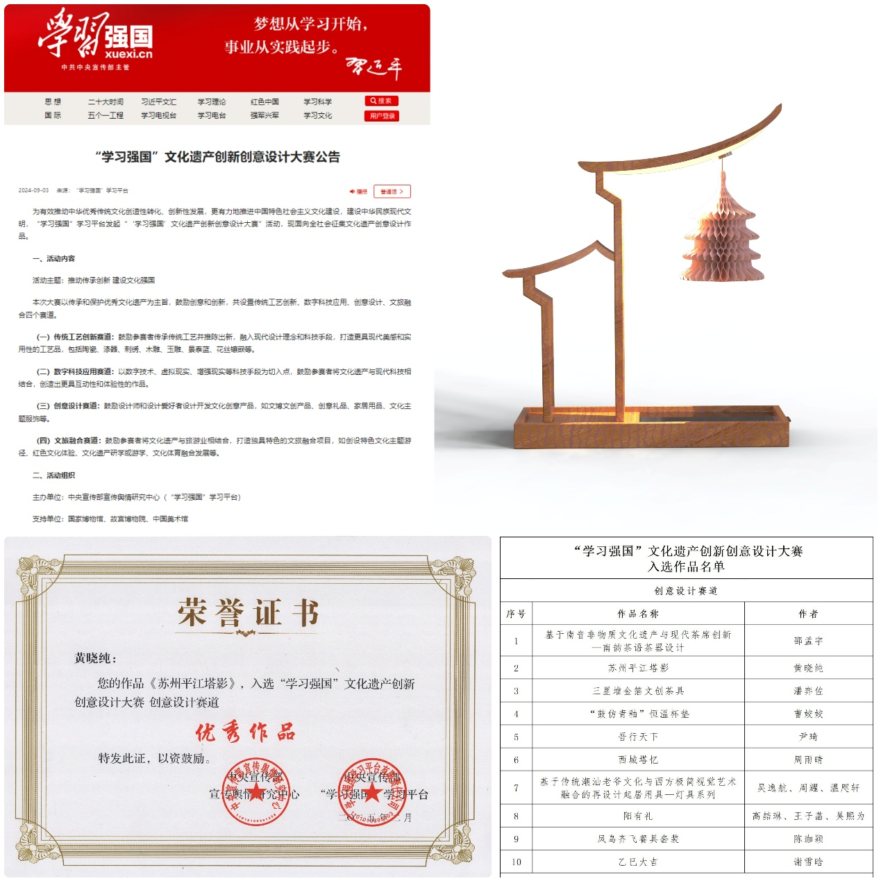 日前,我院工业设计系研究生黄晓纯在“学习强国”学习平台发起的“‘学习强国’文化遗产创新创意设计大赛”中脱颖而出,在“创意设计赛道”斩获第2名佳绩,充分展现了我院“一院一品”党建项目在人才培养中的实践成效。
