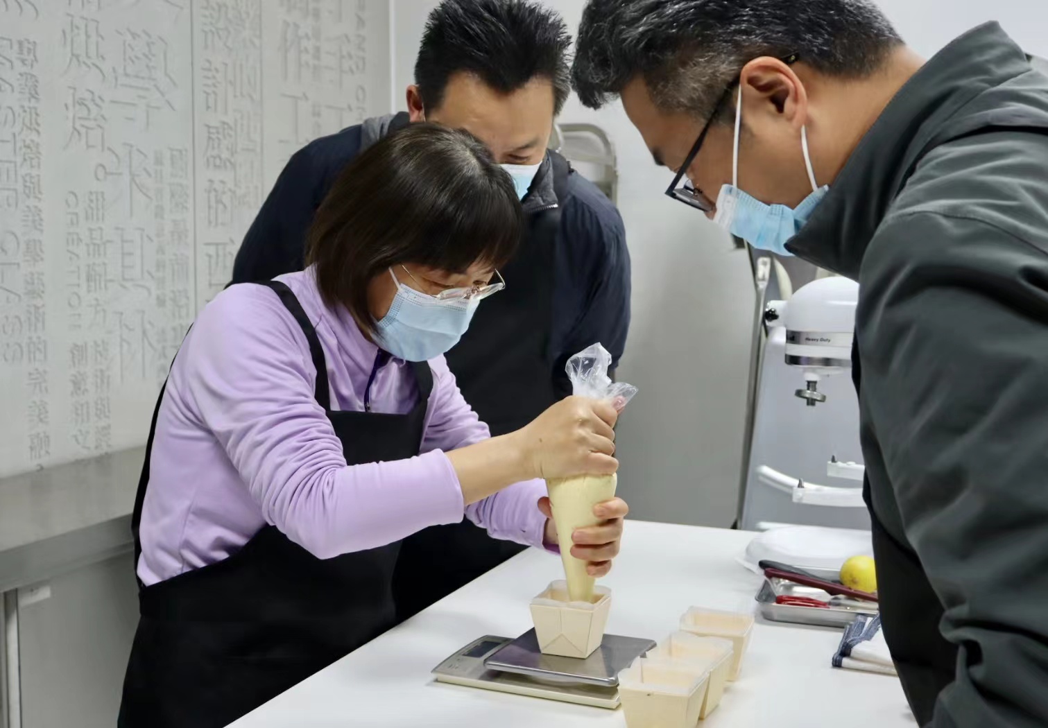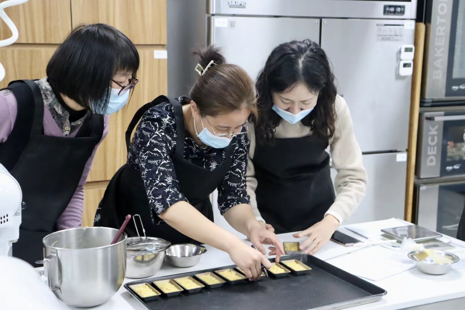 活动伊始,烘焙老师给大家讲解了蛋糕原材料的选择以及制作工艺,并为大家示范磅蛋糕、费南雪制作过程和技巧,让烘焙“零基础”的老师们非常清晰地了解到制作技巧和操作流程。学员们认真地听并且积极发问。