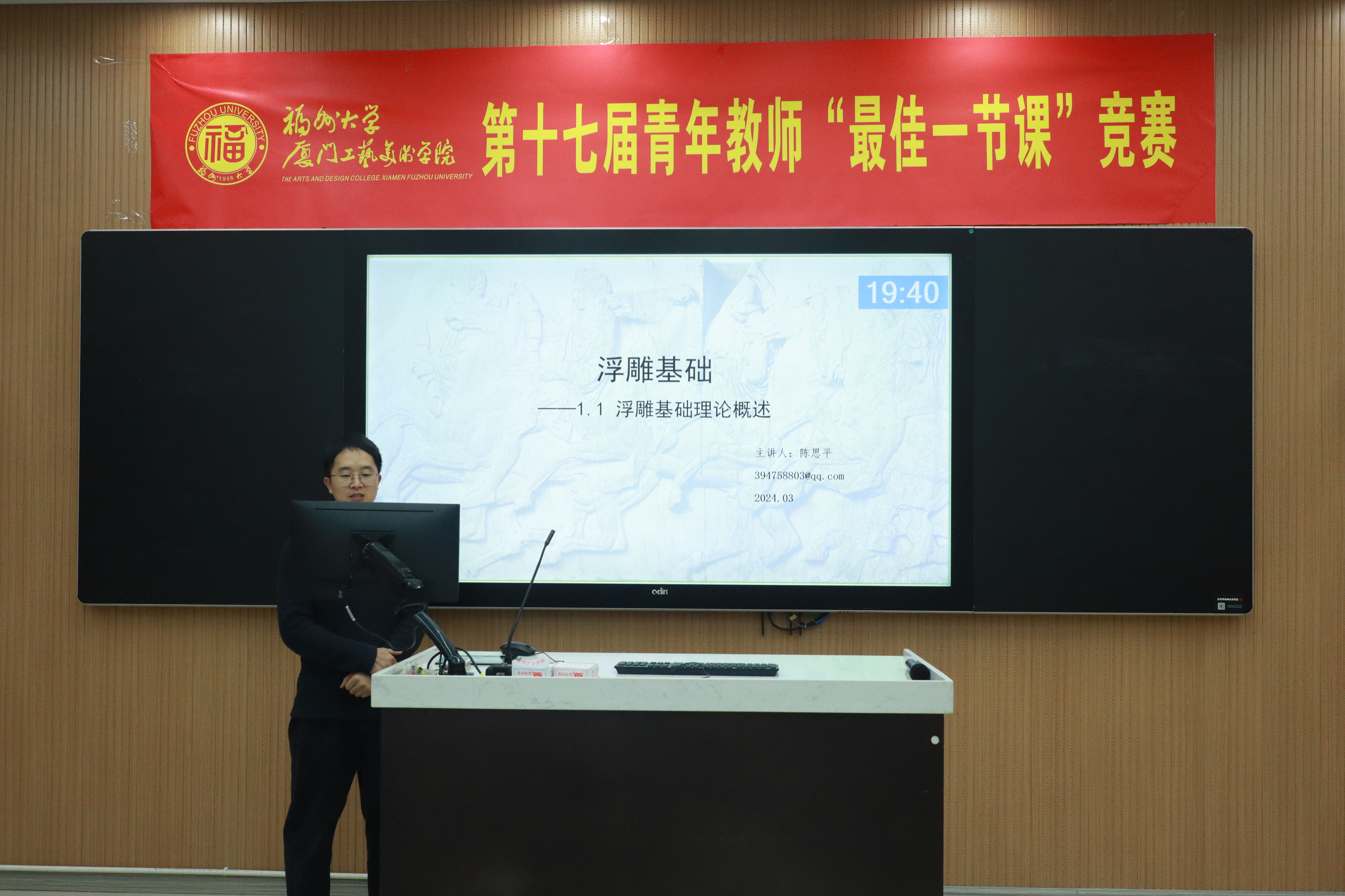 为了深入贯彻党“立德树人”的根本任务,进一步激发我院教师更新教育理念和掌握现代教学方法,推进我院教师教学技能和教学水平的提高,选拔优秀青年教师参加福州大学第二十五届青年教师”最佳一节课”竞赛。3月23日,由我院工会、党政办、教务科联合举办的福州大学厦门工艺美术学院第十七届青年教师”最佳一节课”教学竞赛活动,在2号教学楼208智慧教室顺利举行。 本次竞赛邀请了全国模范教师厦门理工学院教务处副处长王刚教授、学院英浩教授、黄志雄教授、万吉欣教授、彭汉宗博士担任评委,共有8位青年教师参加此次竞赛。
