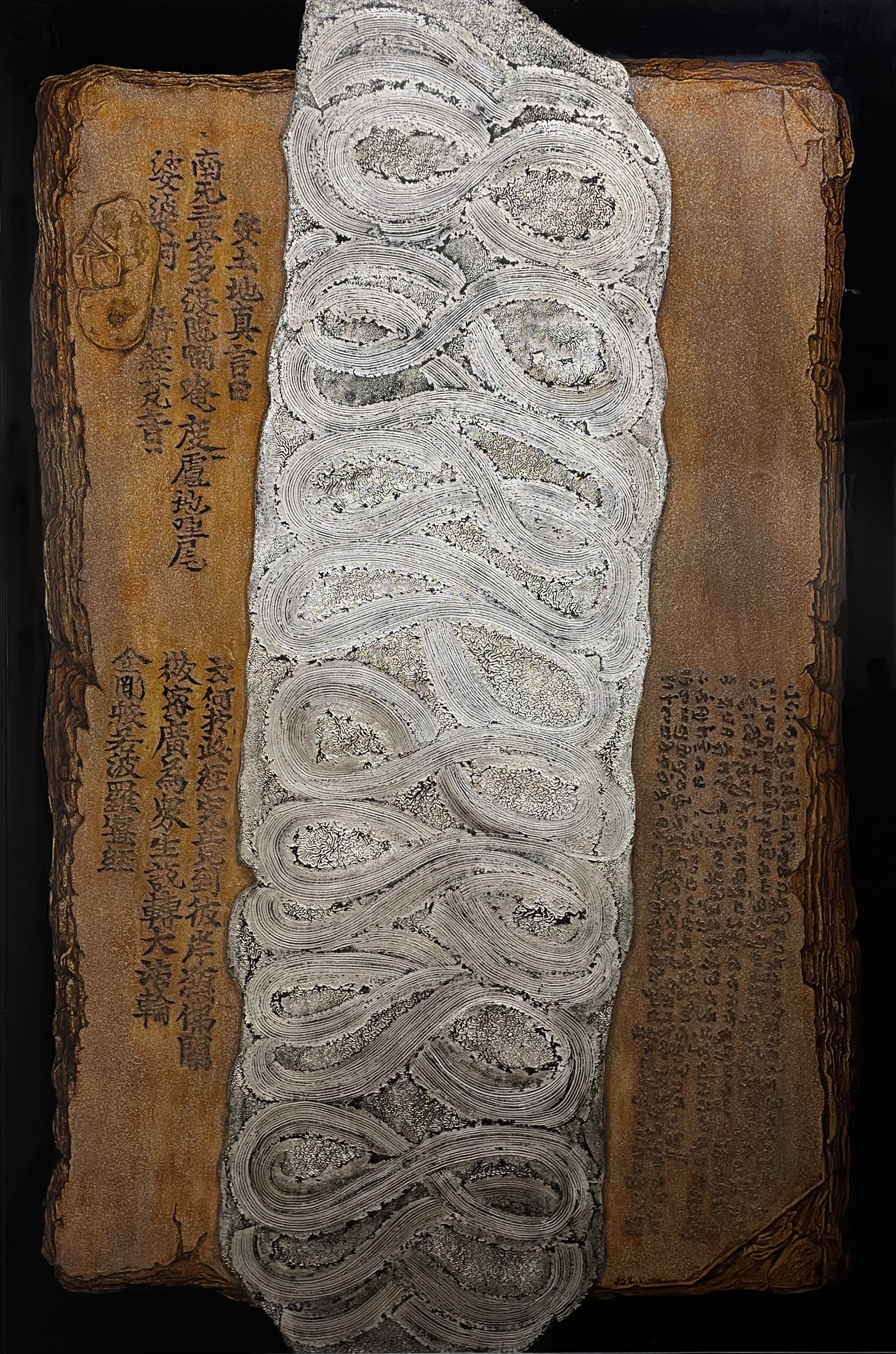 漆画《丝路•对语No2》,获第五届全国漆画展(入会资格),中国美术馆收藏,尺寸:180cm乘140cm,2021年