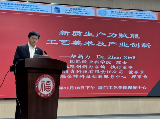 11月18日,国际欧亚科学院院士、科技部二级研究员赵新力在我院图展中心鹭潮厅举办“新质生产力赋能工艺美术及产业创新”专题讲座,讲座由我院副院长张健教授主持,我院近350名骨干教师、本硕学生聆听讲座,本次讲座被列为“守正创新 跨越发展福州大学厦门工艺美术学院建院73周年系列活动”之一。