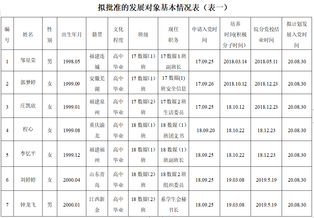为了加强对发展党员工作的民主监督,确保发展新党员的质量,现将入党积极分子邹星荣等七位同志的有关情况进行公示(详见《拟批准的发展对象基本情况表》),公示期6月6日至6月12日止。有异议者,可向学院党委反映。