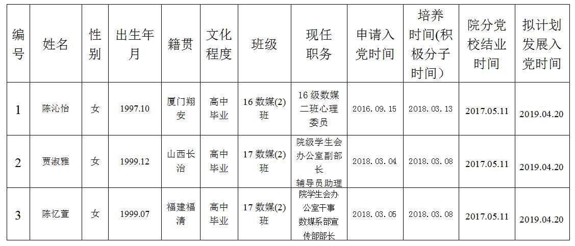关于拟批准陈沁怡等3位同志为党的发展对象的公示书