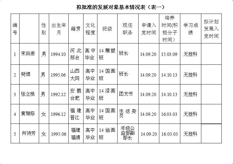 为了加强对发展党员工作的民主监督,确保发展新党员的质量,现将入党积极分子宋田崇等6位同志的有关情况进行公示(详见《拟批准的发展对象基本情况表》),公示期3月8日至3月12日止。有异议者,可向学院党委反映。