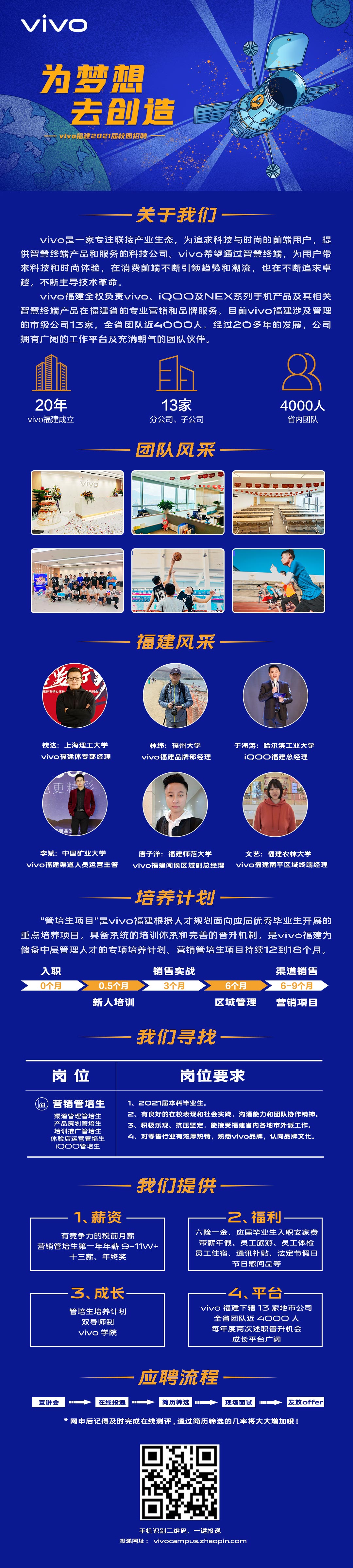 【招聘岗位】营销管培生【发展方向】渠道管理、产品策划、培训推广、体验店运营、iQOO管理等【薪 资】9W-11W/年【福 利】六险一金、安家费、十三薪、年终奖、高温补贴、员工体检、内购优惠、员工旅游等【住 宿】提供免费员工宿舍【网申地址】vivocampus.zhaopin.com vivo福建管培生项目,让你在校园与职场无缝衔接,提供健全的培养机制,广阔的发展平台,以及全方位的保障,快来加入我们吧!